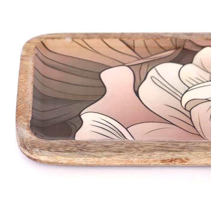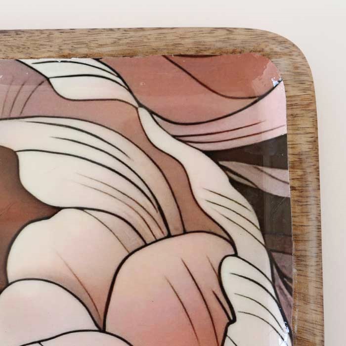 Bellissimo vassoio rettangolare, realizzato in legno di mango con piano laccato e decorazione di Peonie nelle sfumature del Rosa.