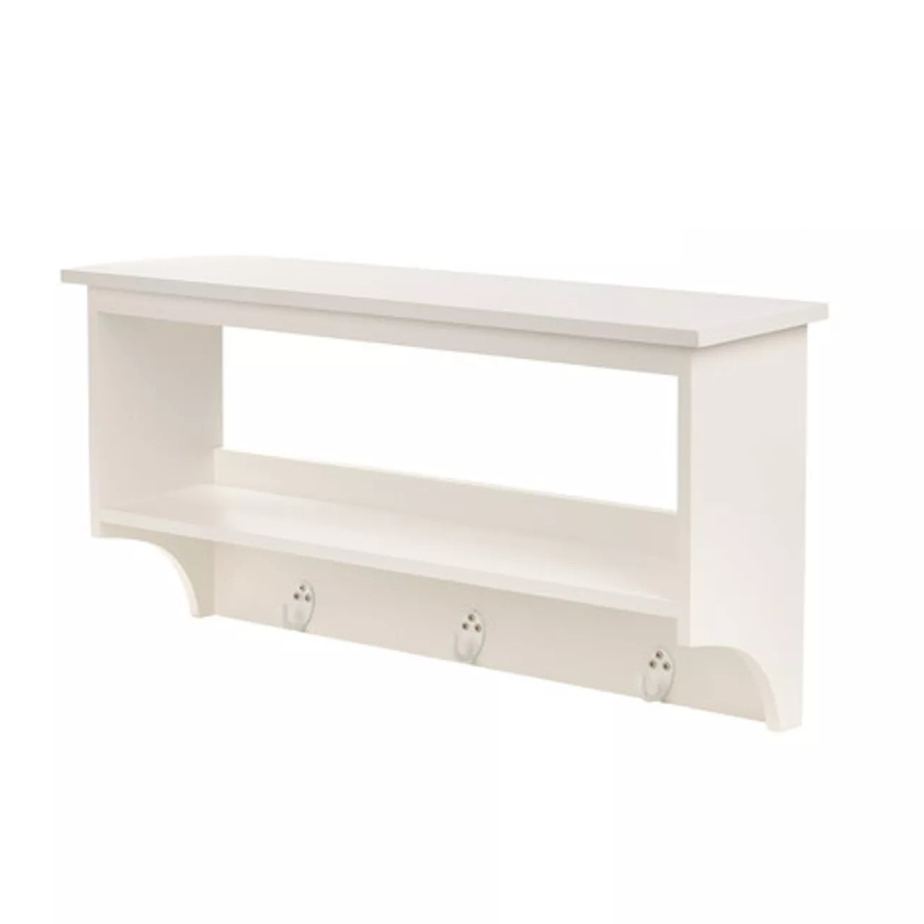 Deliziosa mensola realizzata in legno con 2 ripiani e 3 ganci. Grazie alle ridotte dimensioni può essere utilizzata in cucina, in camera, ma anche in bagno.