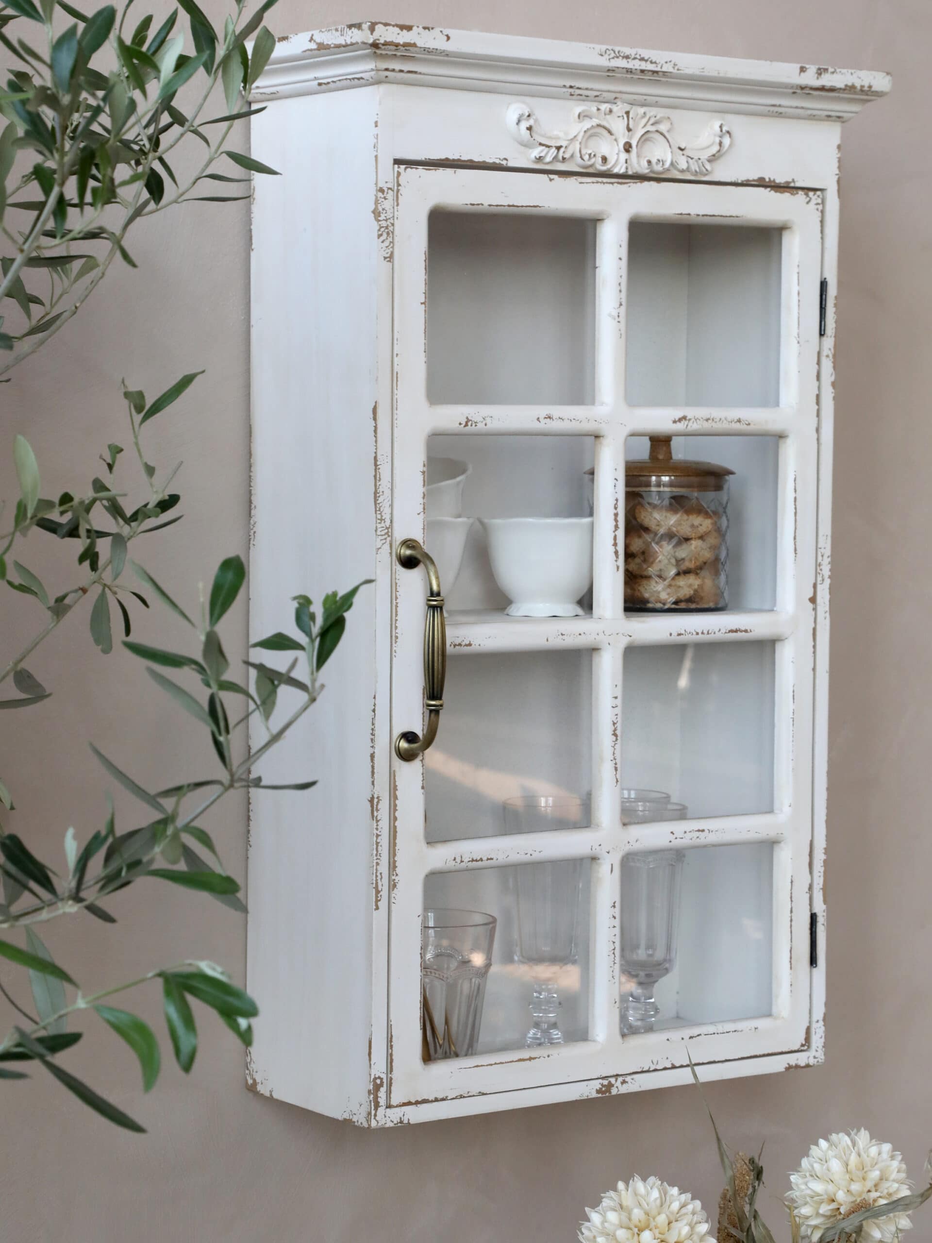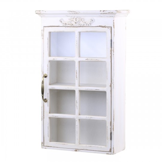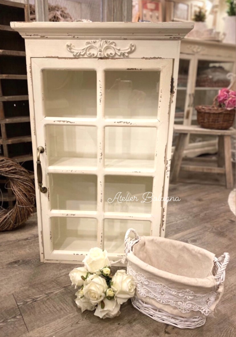 Bellissimo pensile realizzato in legno con 1 anta a battente ed 1 ripiano. L’anta ha il classico motivo a finestrella ed una bellissima maniglia in ottone lavorato. La parte alta del pensile è arricchita da un fregio applicato.