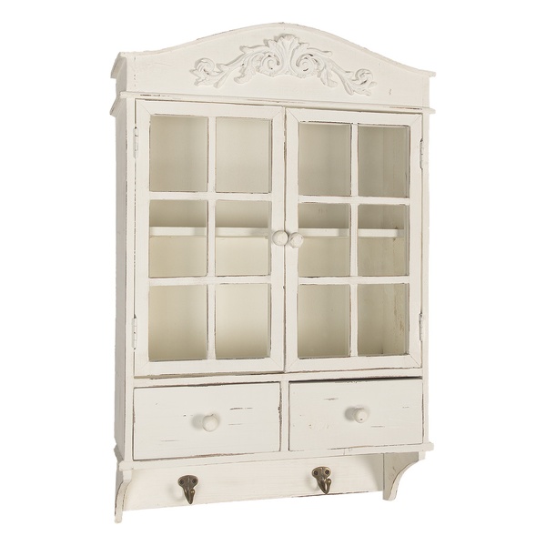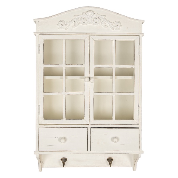 Bellissimo pensile realizzato artigianalmente in legno con 2 ante a battente con il classico motivo a finestrella, 1 ripiano, 2 cassetti e 2 ganci. La parte alta del pensile è arricchita da un fregio applicato.