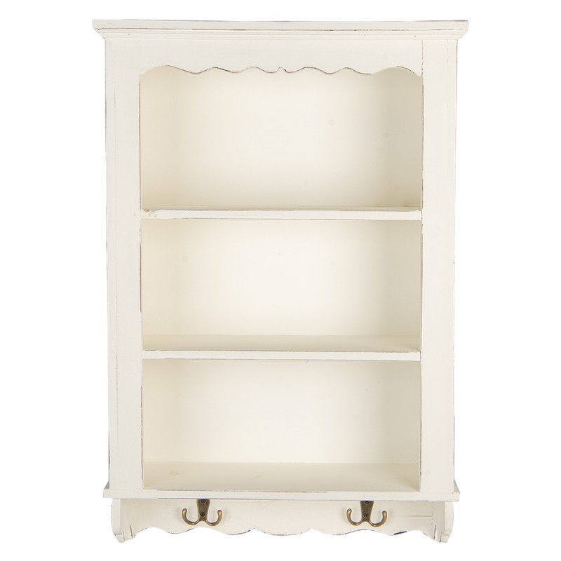 Bellissimo pensile realizzato in legno, con 3 ripiani e 2 ganci doppi. Colore Avorio chiaro con finitura shabby effetto vissuto.