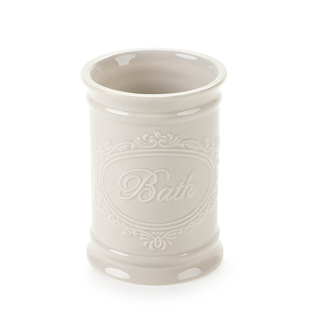 Grazioso bicchiere portaspazzolini in ceramica decorato con la scritta BATH in rilievo