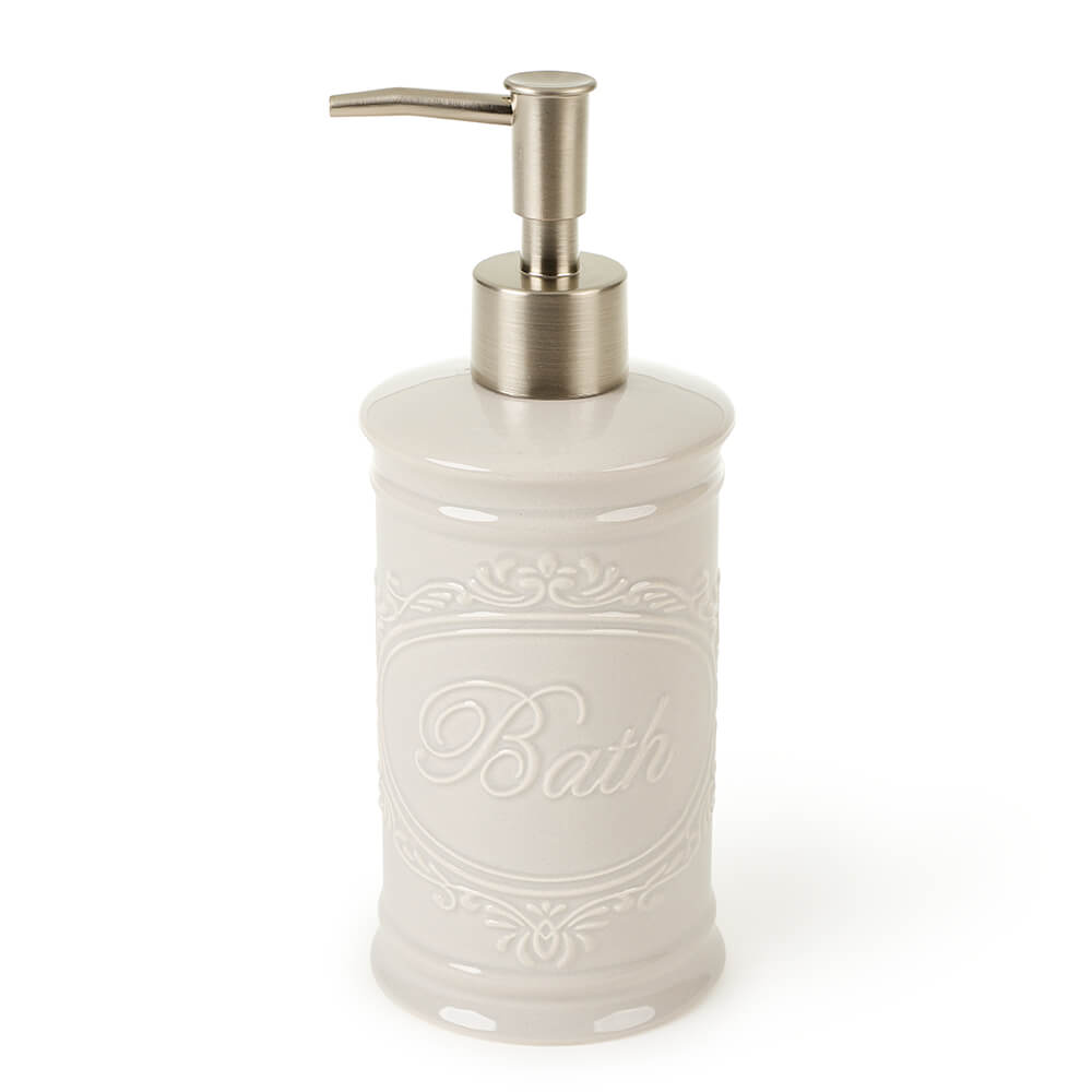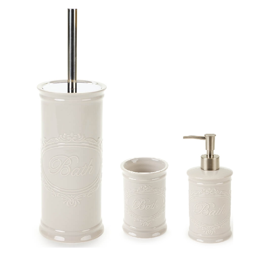 Grazioso set bagno in ceramica decorato con la scritta BATH in rilievo