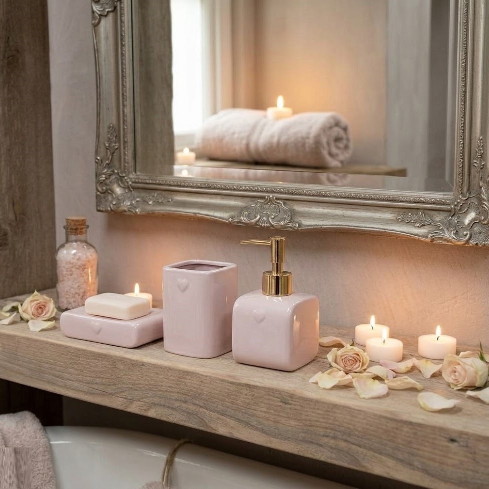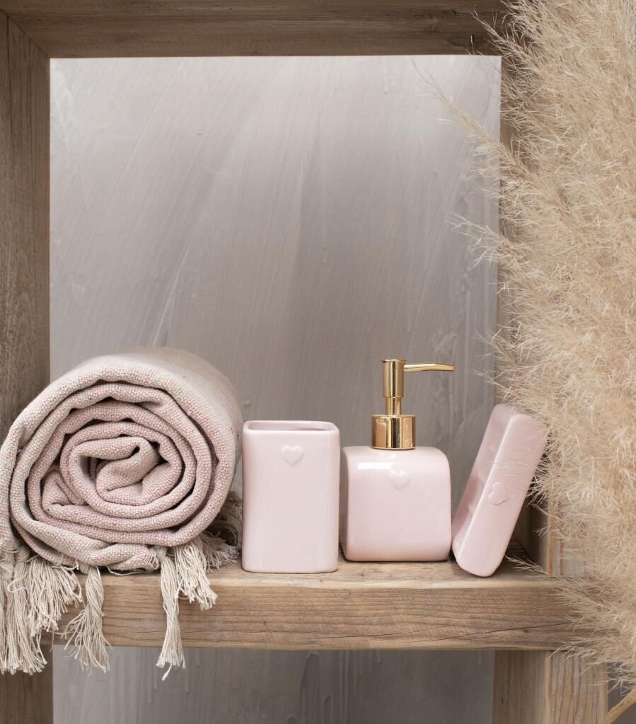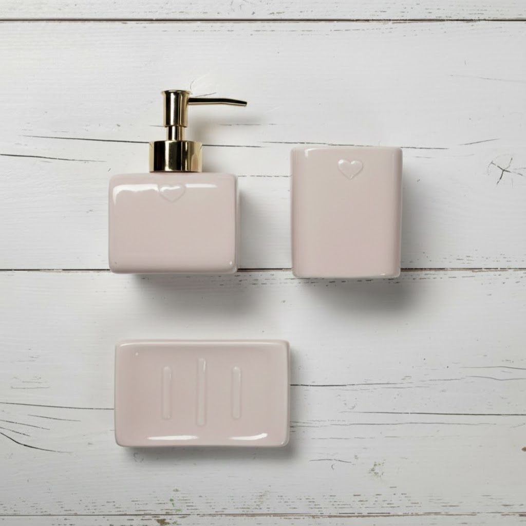 Il set è composto da Dosasapone cm 7,5x14h, porta spazzolini cm 6,8×9,5 e piattino portasapone cm 11×8,2×2,8h