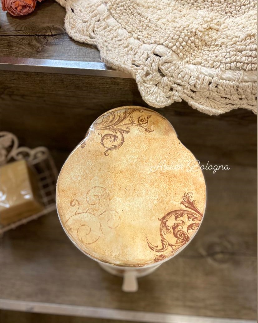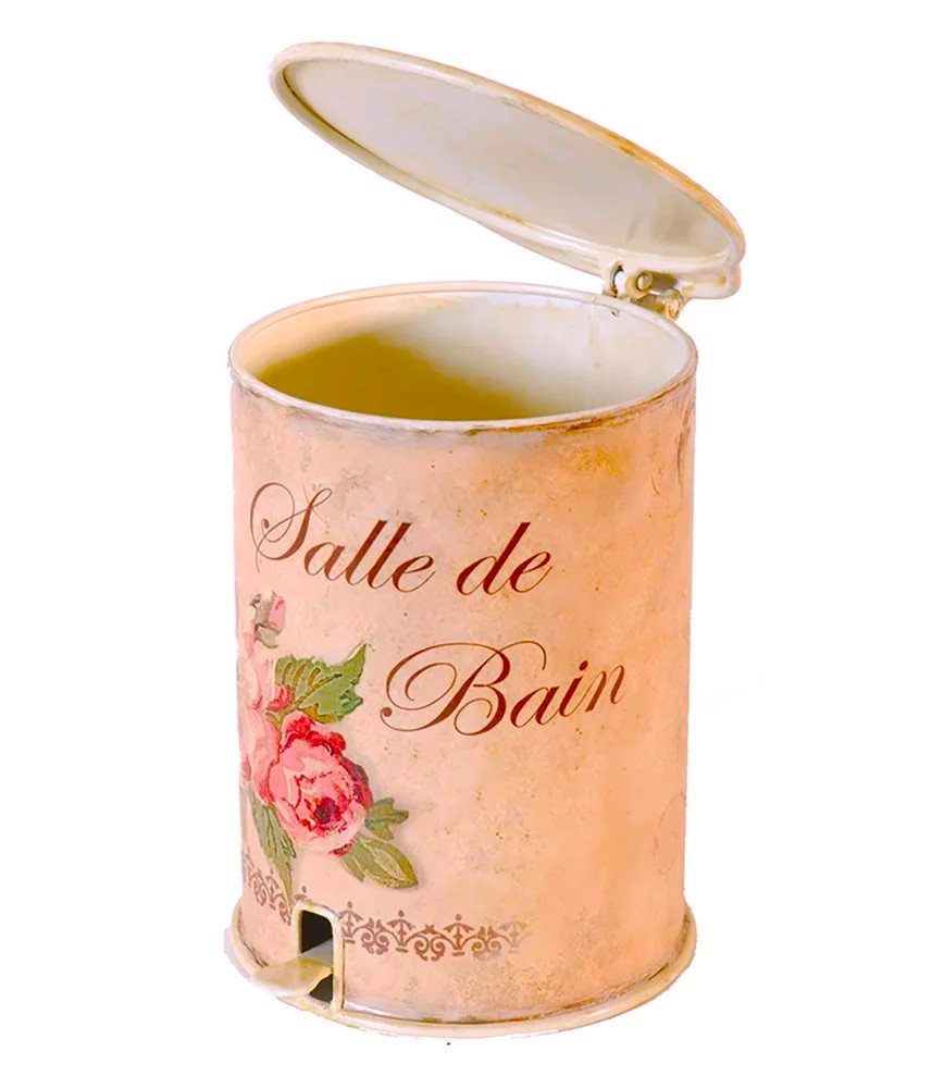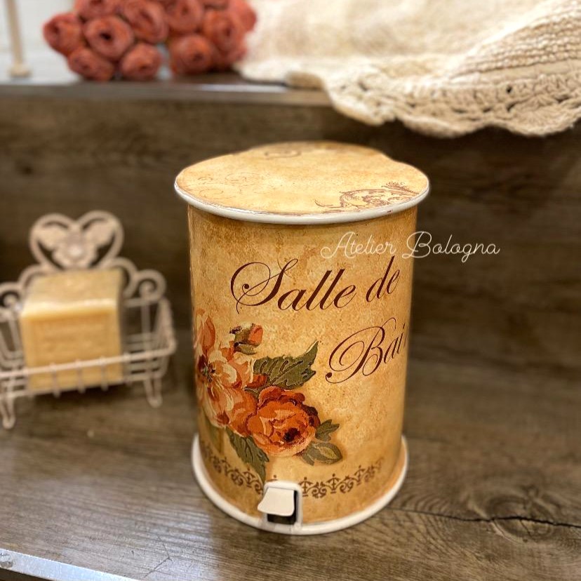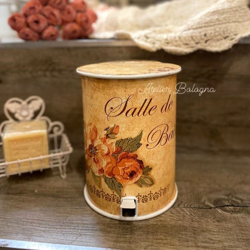 Graziosissimo piccolo bidoncino a pedale, decorato nei toni caldi del Rosa e Salmone con rose e scritte vintage.