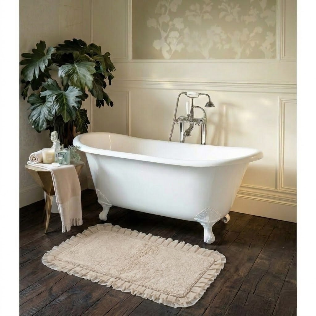 Delizioso tappetino rettangolare realizzato in puro cotone con doppia rouche sui 4 lati