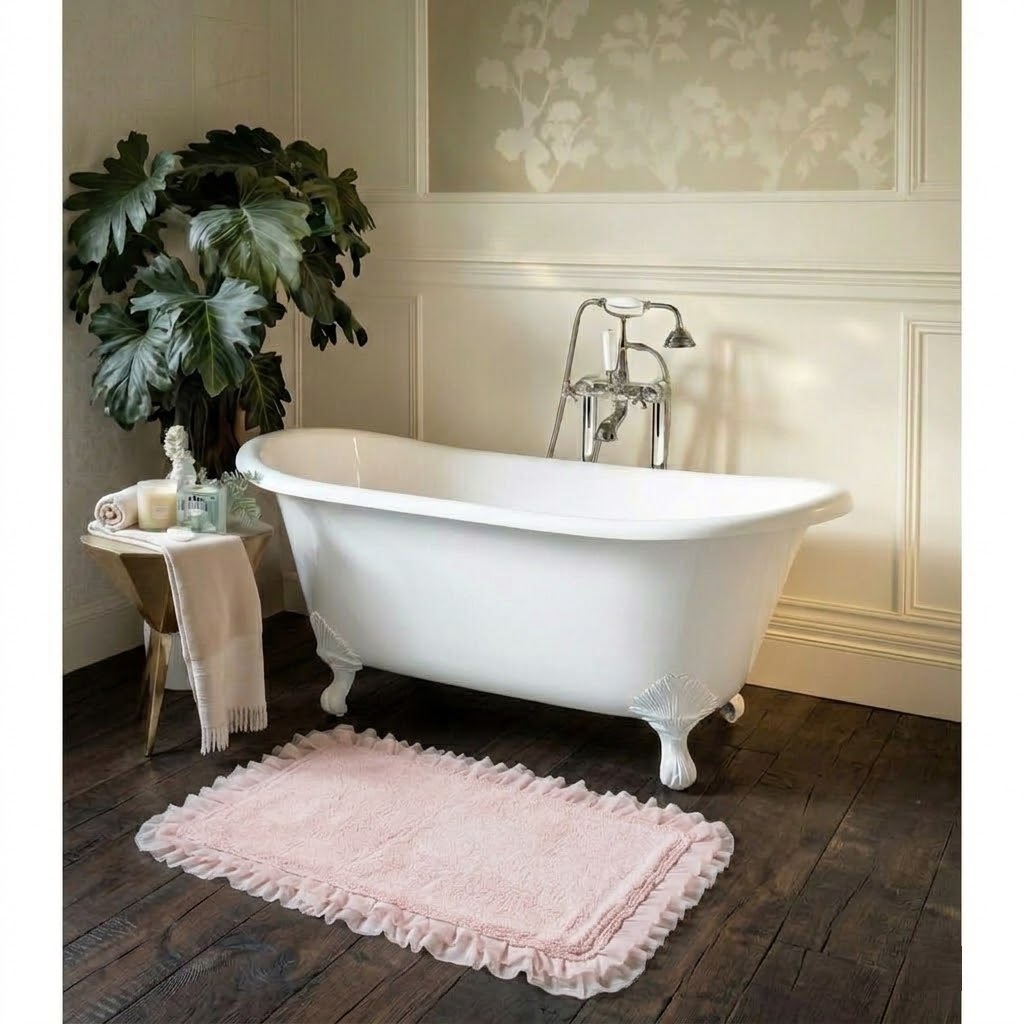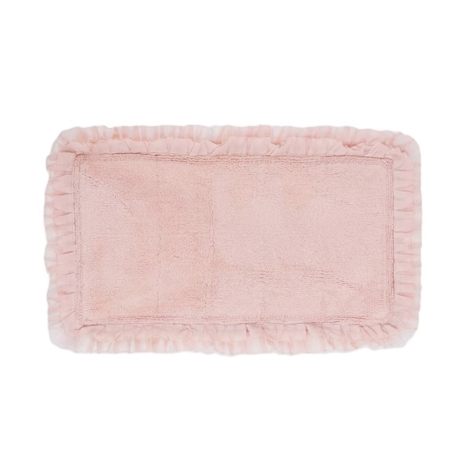 Delizioso tappetino rettangolare realizzato in puro cotone con doppia rouche sui 4 lati