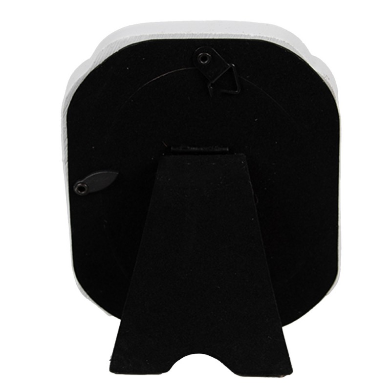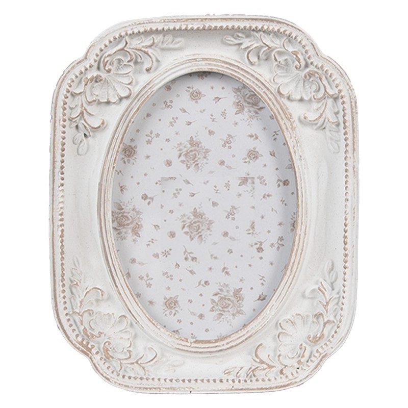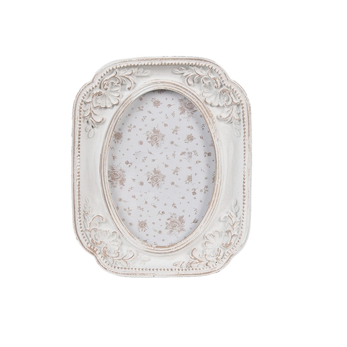 Deliziosa piccola cornice realizzata in resina, con bordo lavorato in rilievo. Colore Bianco anticato.