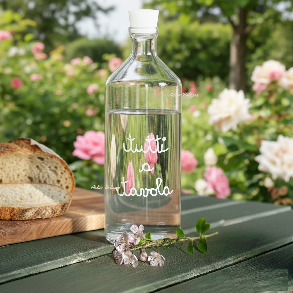 Bottiglia in vetro con serigrafia bianca “Tutti a Tavola“. Capacità 1,4 l.