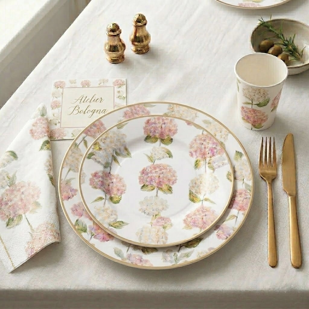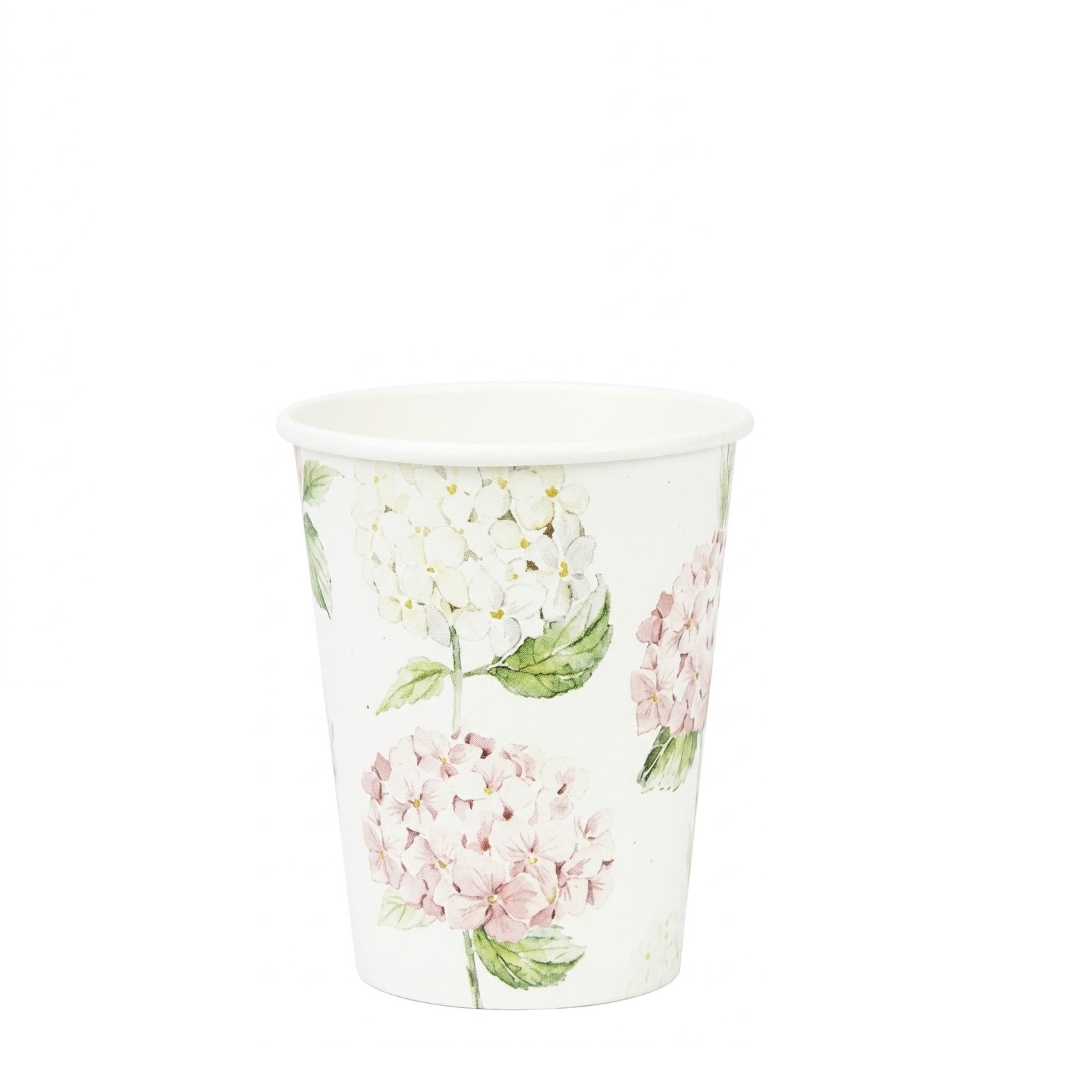 Set di 8 bicchieri realizzati in carta con un bellissimo decoro di Ortensie.