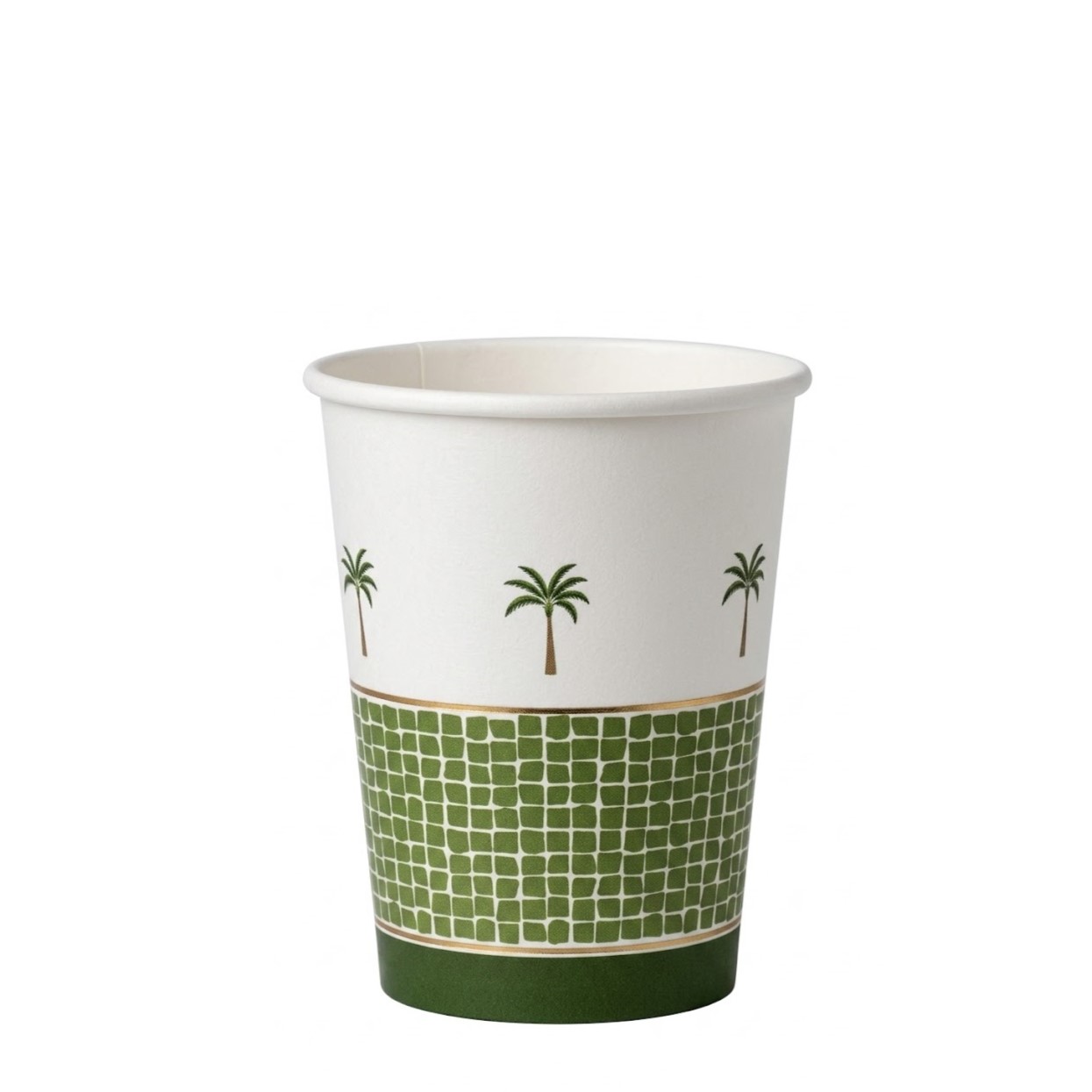 Set di 8 bellissimi bicchieri realizzati in carta con un elegante decoro Tropical Chic con Palma e profili dorati, a richiamo di atmosfere coloniali.
