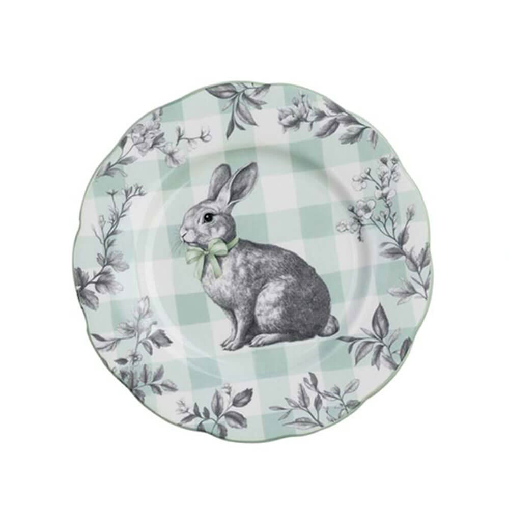 Bellissimo piatto dessert realizzato in ceramica, decorato con elegante motivo a quadretti Vicky Bianchi e Verdi, un tenero coniglietto al centro, e decorazione floreale sui bordi nei toni del Grigio.