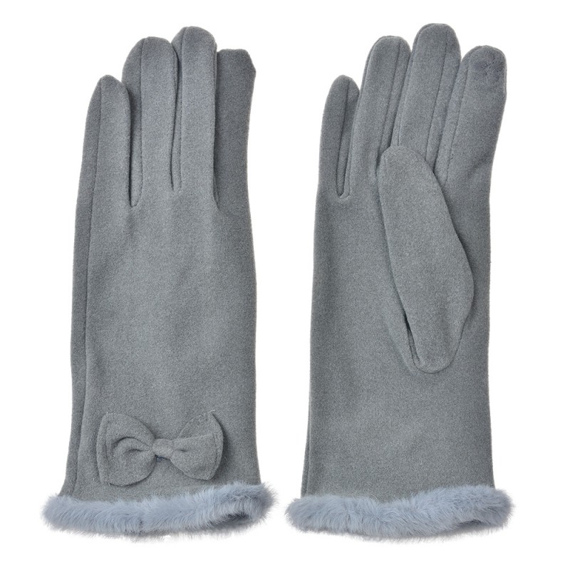 Delizioso paio di guanti realizzati in morbidissima microfibra ed impreziositi da un fiocchetto in tinta sul dorso e dal bordo in ecopelliccia grigia