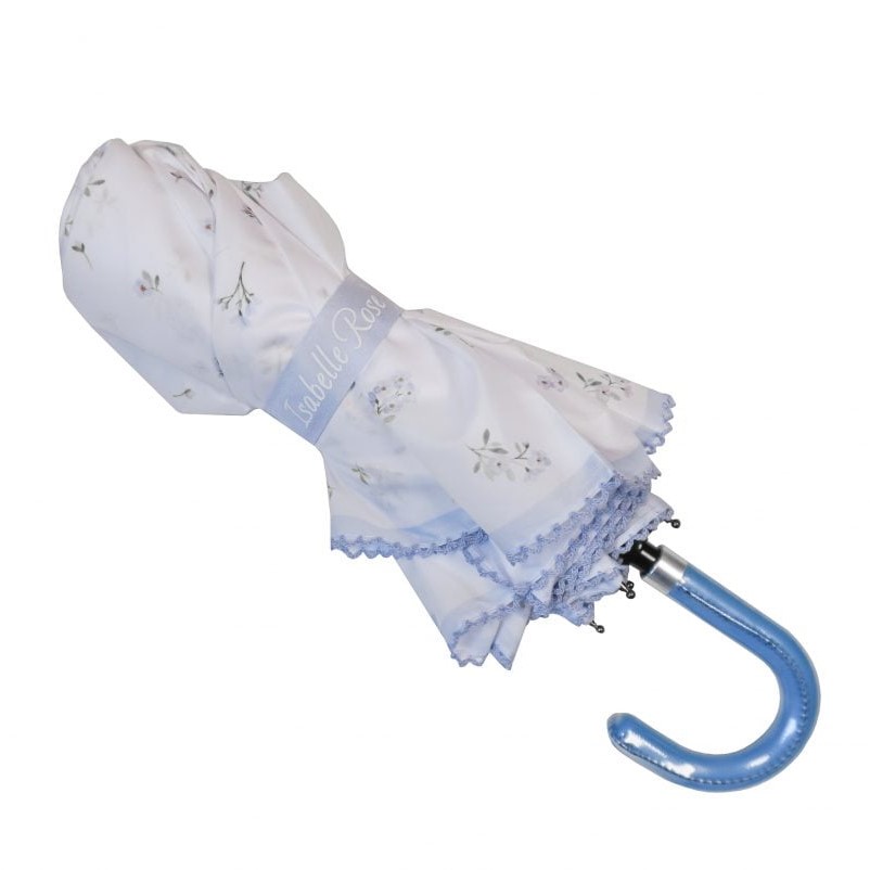 Bellissimo ombrello con struttura in metallo e copertura in tessuto impermeabile decorato con delicati fiorellini Azzurro chiarissimo e foglioline Verdi su sfondo Bianco. E’ impreziosito da un bordino di pizzo Azzurro su tutto il bordo ed elegante manico Blu.