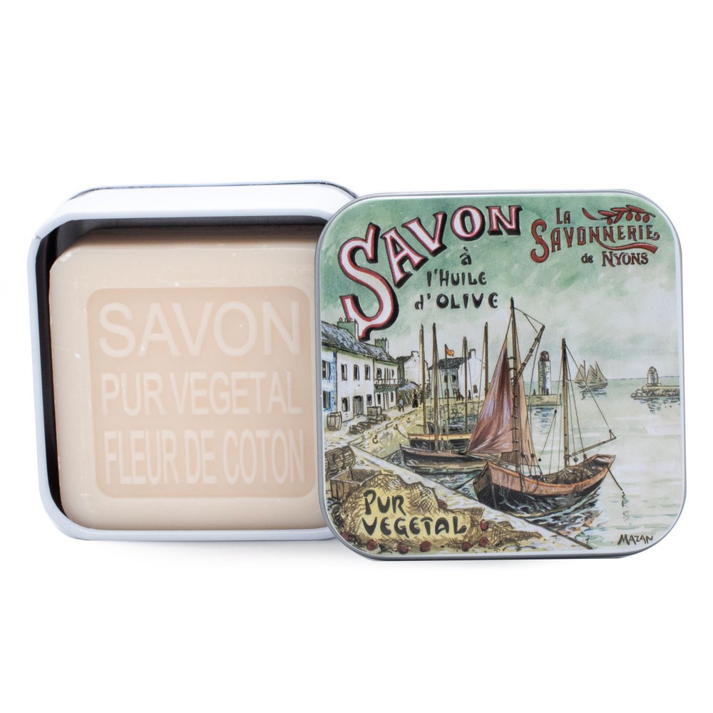 Bellissima scatola di metallo decorata in stile vintage, fornita con un sapone da 100 g al delicato profumo di Fiori di Cotone, realizzato con ingredienti naturali e arricchito con burro di karitè biologico e olio d’oliva Nyons dalle proprietà emollienti e protettive. Questo sapone è adatto a tutti i tipi di pelle.