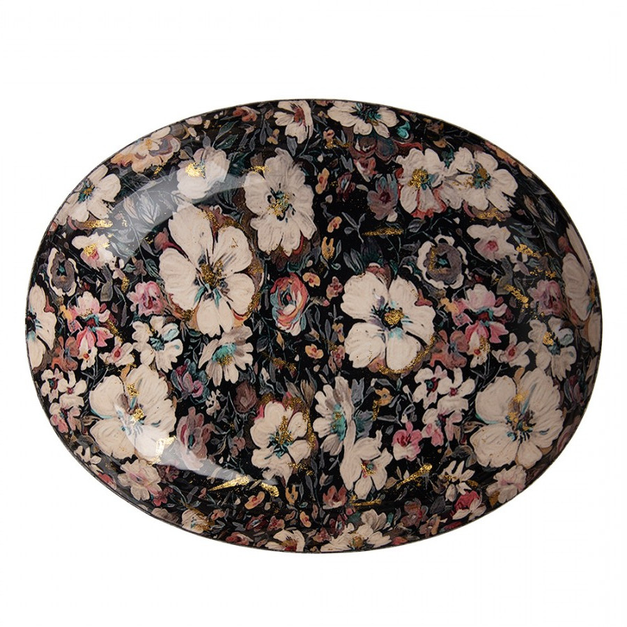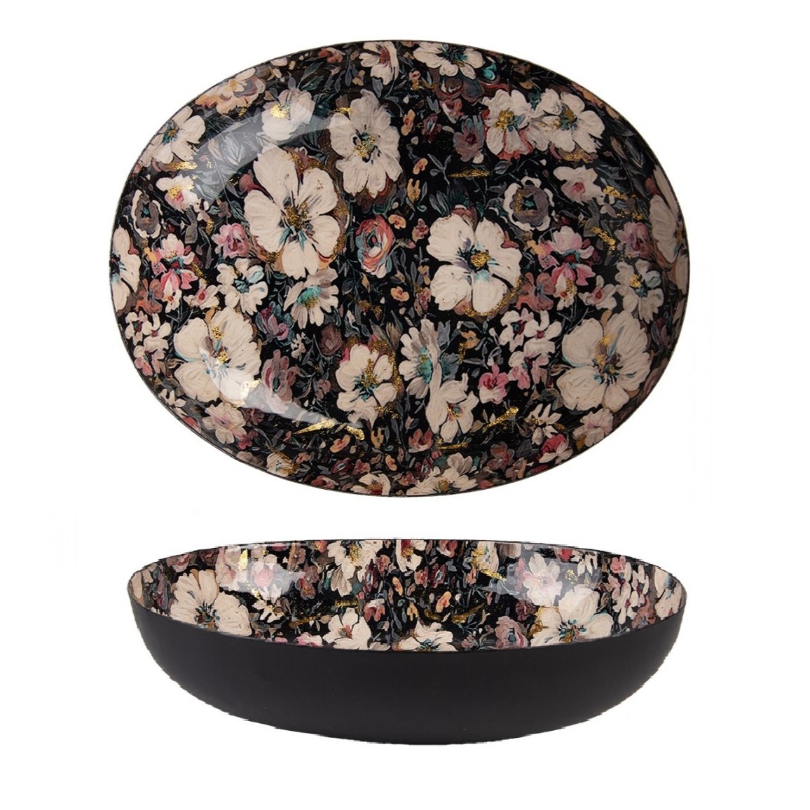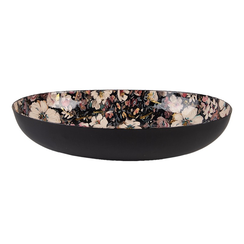 Bellissimo centrotavola realizzato in metallo, con all’interno decoro floreale smaltato nei toni del rosa su sfondo nero.