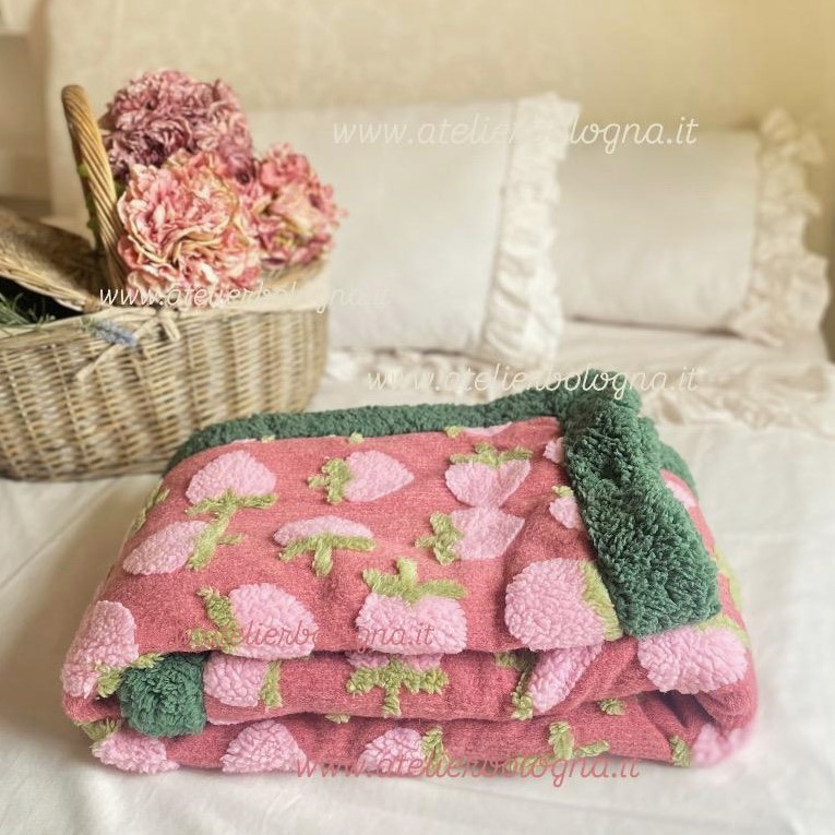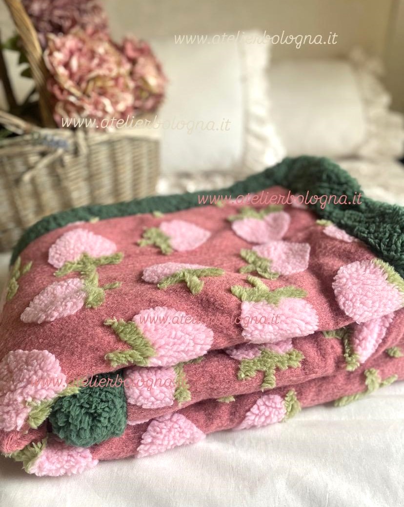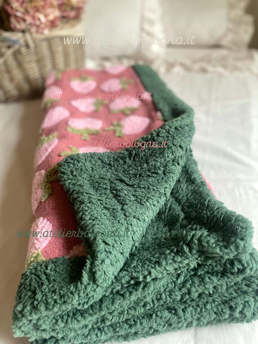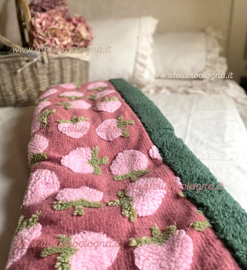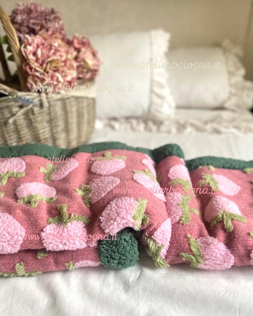 Sul fronte è decorato da graziose fragole in rilievo nei toni polverosi del Rosa con foglioline Verde chiaro su base Malva, ed impreziosito tutt’attorno da un bordo in lanetta sherpa che riprende il colore Verde del retro.