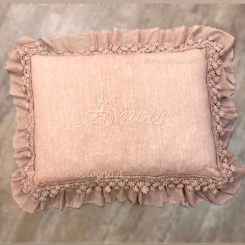 Meraviglioso e romantico cuscino realizzato in lino e impreziosito sui 4 lati da doppia rouche di garza e tulle e pizzo applicato. Sul davanti è ricamata la scritta “Amour” in colore tono su tono