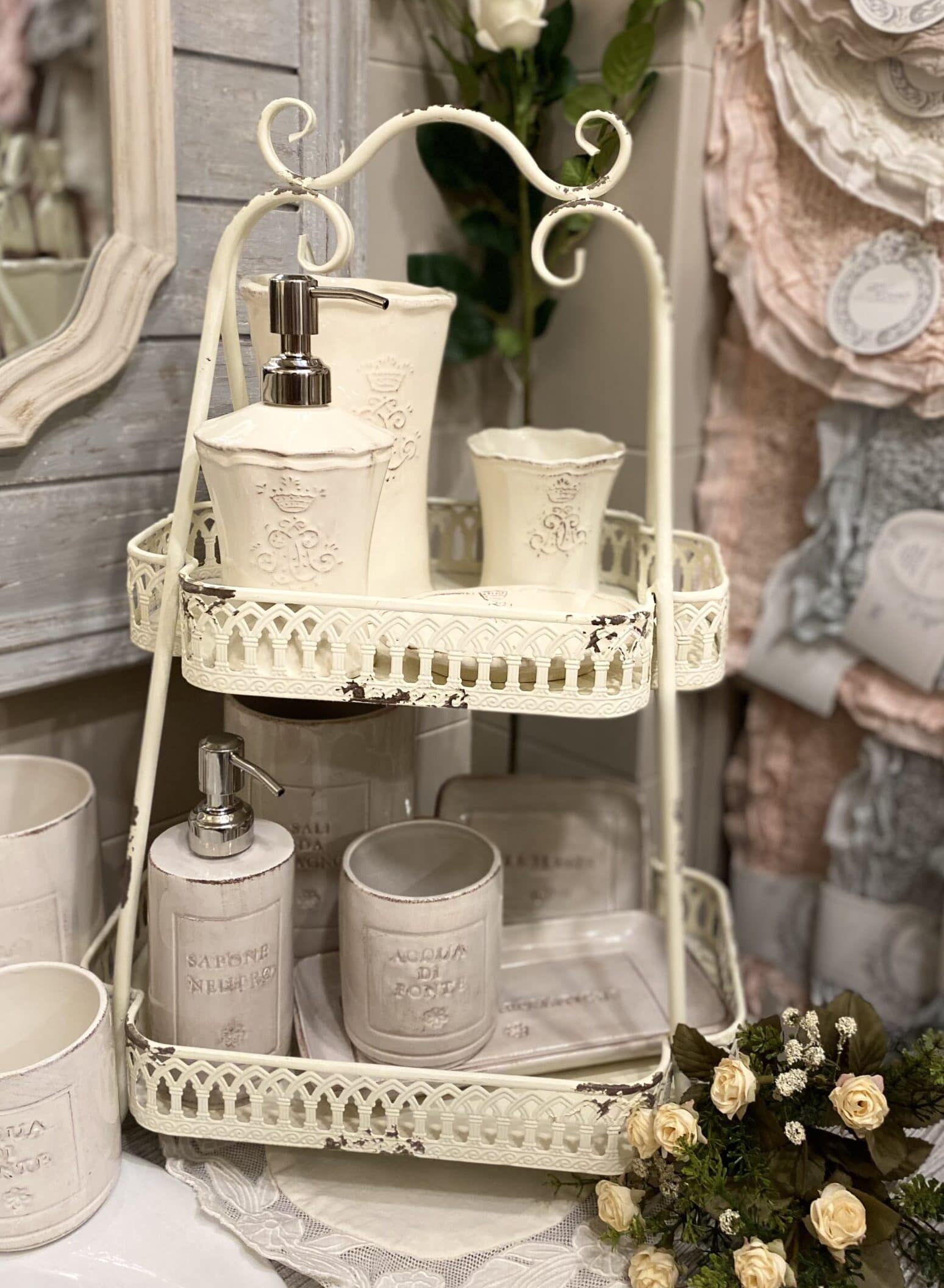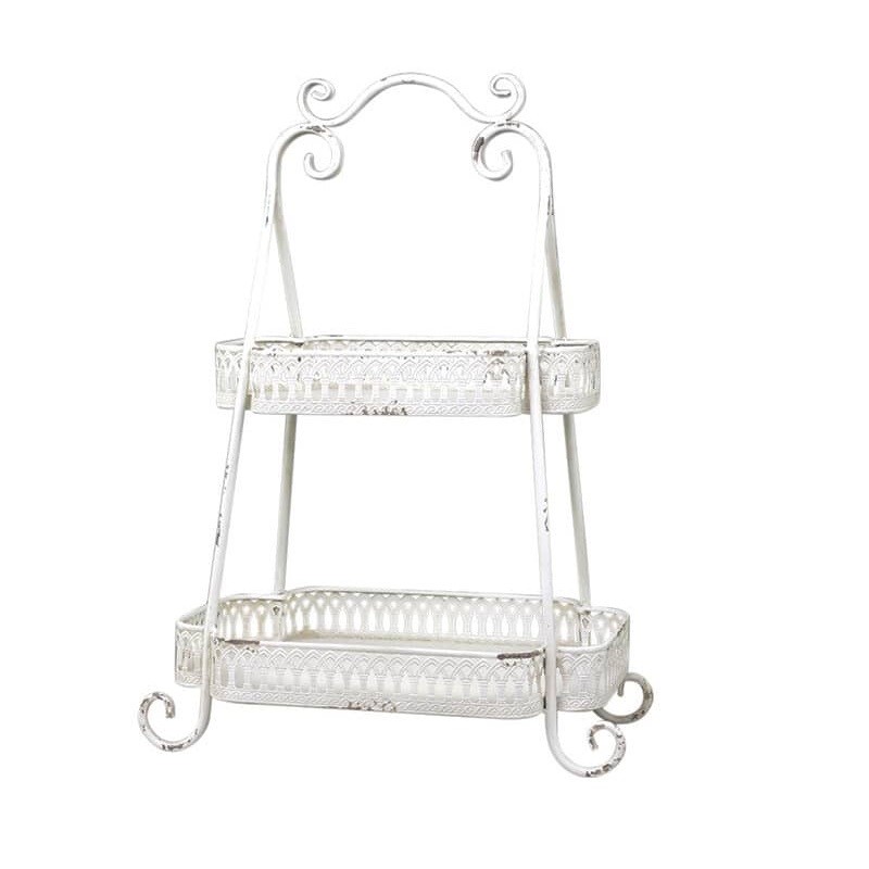 Bellissima alzata a 2 piani, realizzata in ferro. Ogni piano ha un bel bordo lavorato. Colore Bianco antichizzato