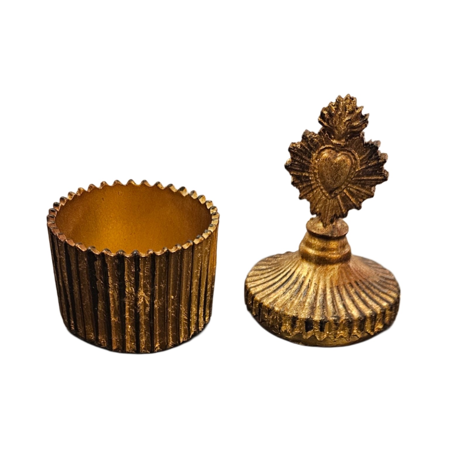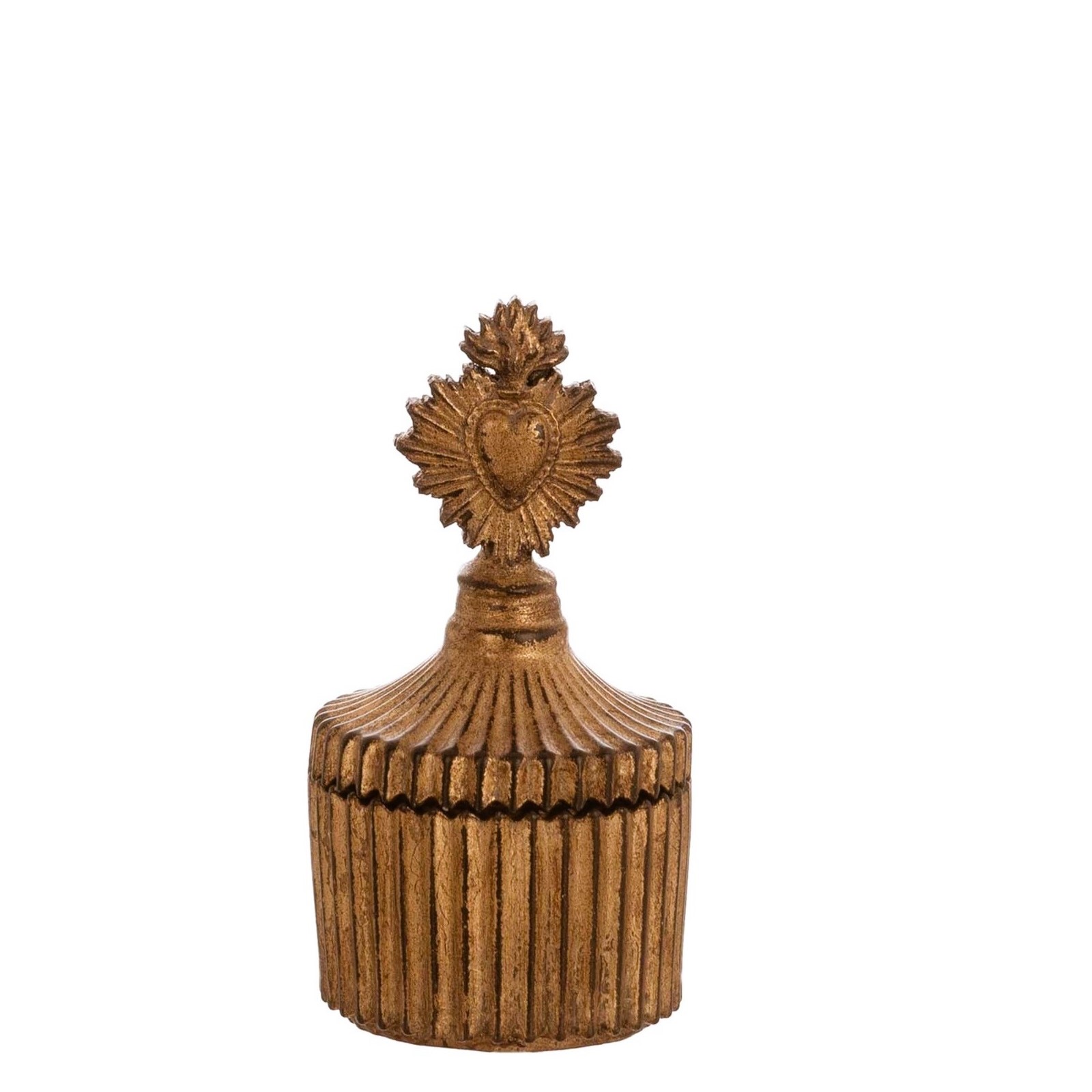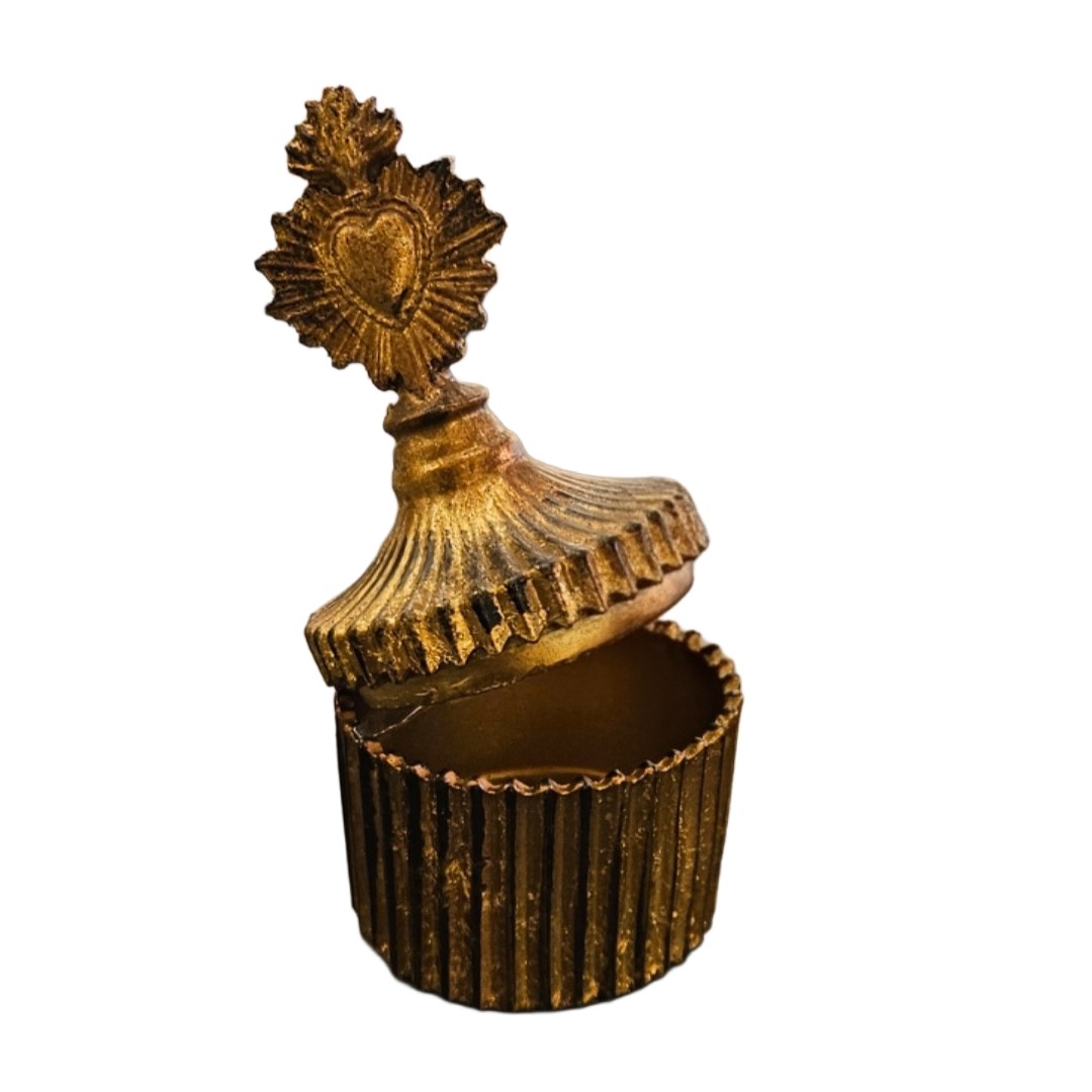 Il coperchio è impreziosito da un cuore ex voto fiammeggiante, che richiama l’estetica sacra e decorativa della collezione omonima. La base presenta una texture scanalata che aggiunge profondità e carattere. Ideale come contenitore per piccoli bijoux o come elemento decorativo su toilette, comodini o ripiani shabby chic.