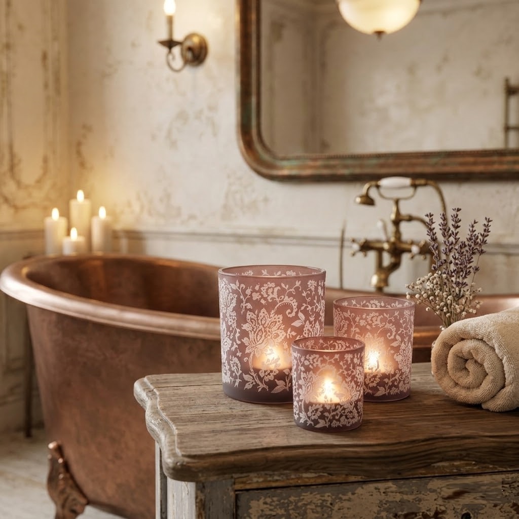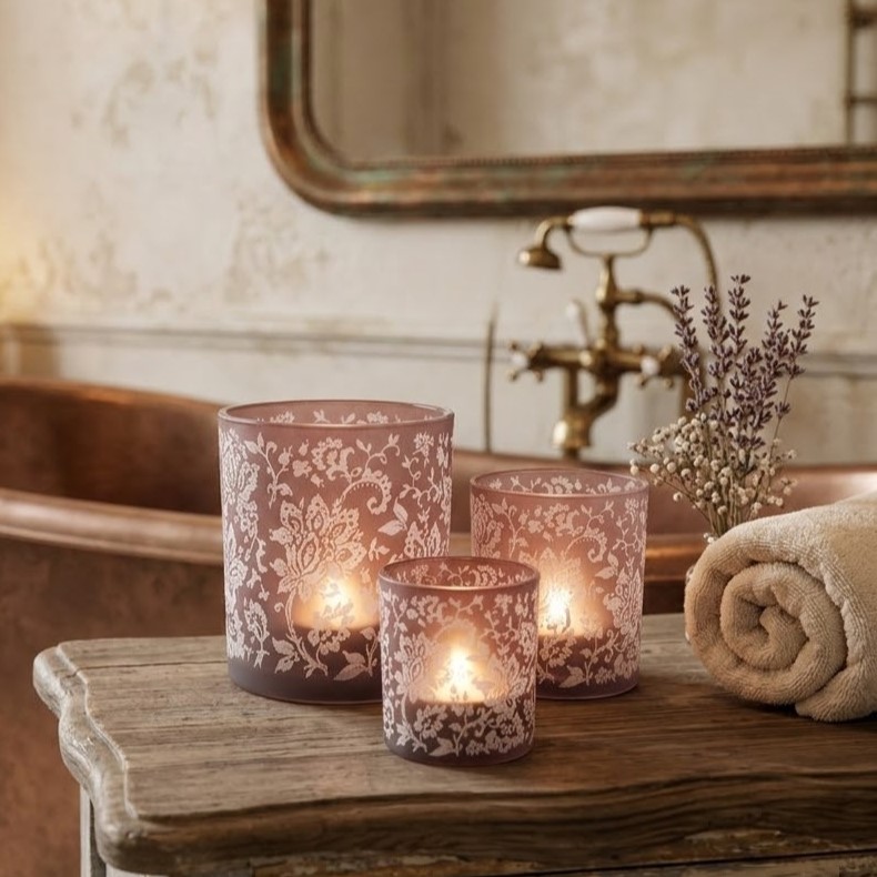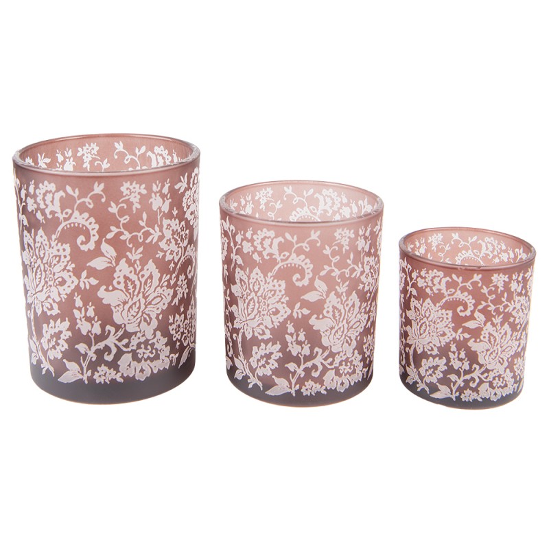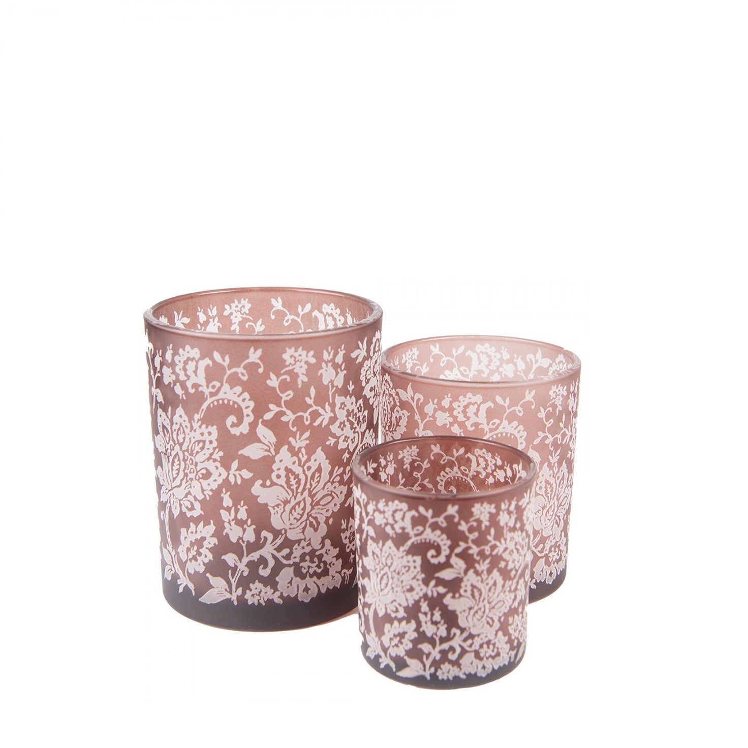 Bellissimo set composto da 3 portacandele di diverse che permettono di creare una composizione dinamica su diversi livelli. I portacandele sono realizzati in vetro color malva con la superficie interamente decorata con un raffinato disegno floreale.