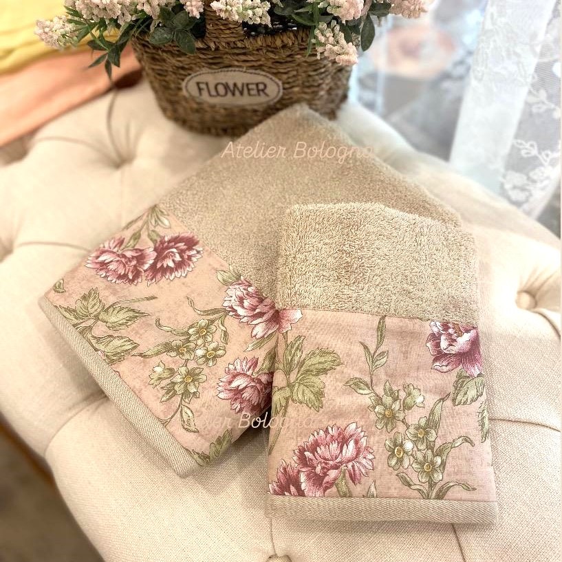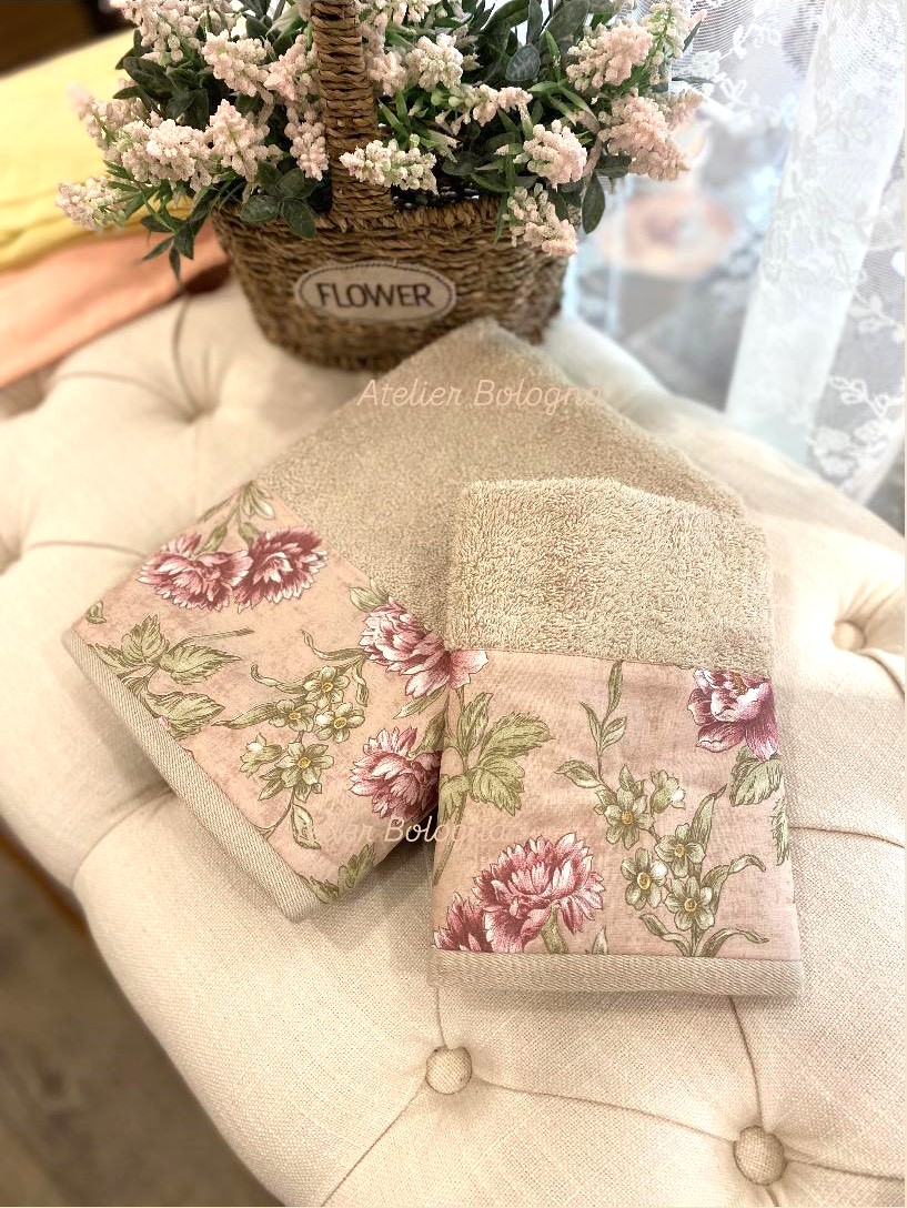 Bellissimo set asciugamani viso più ospite, realizzati in morbida spugna di puro cotone, impreziositi da un bordo con stampa a tema floreale.