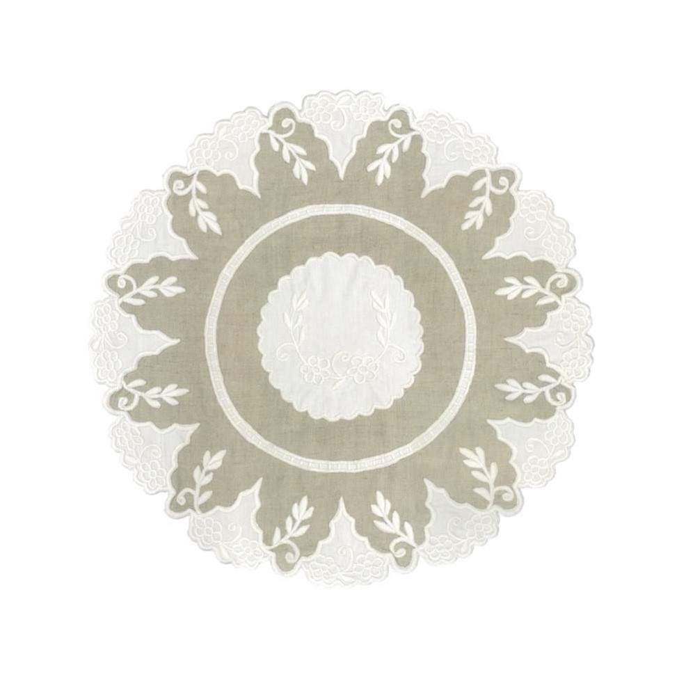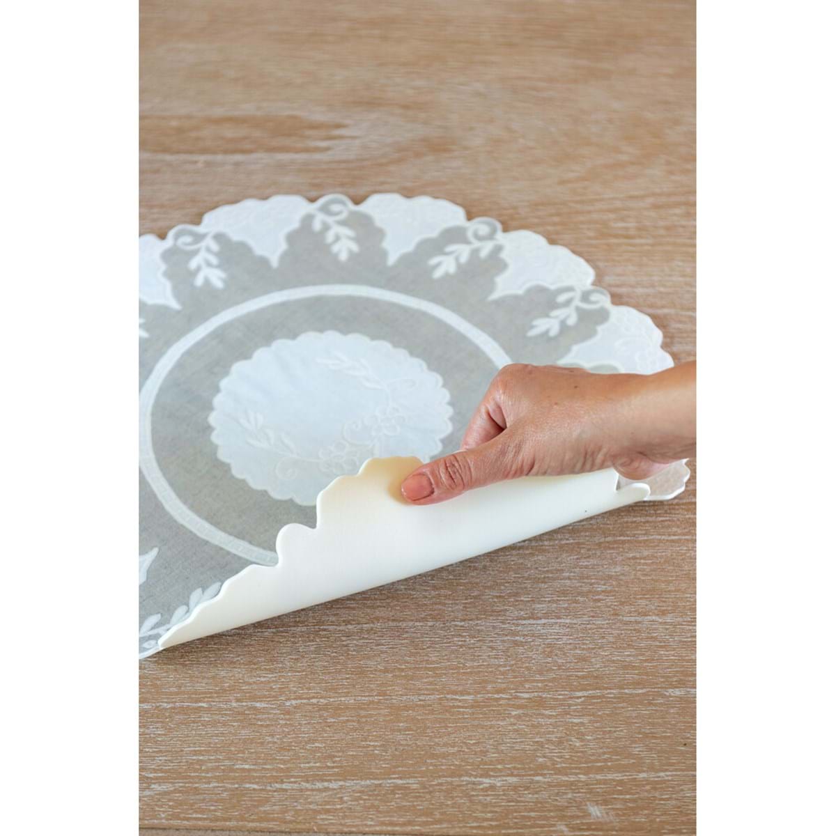Bellissima tovaglietta di forma rotonda realizzata in vinile con stampa effetto pizzo. Particolarmente bella e pratica, può essere utilizzata anche come sottopiatto con o senza tovaglia.
