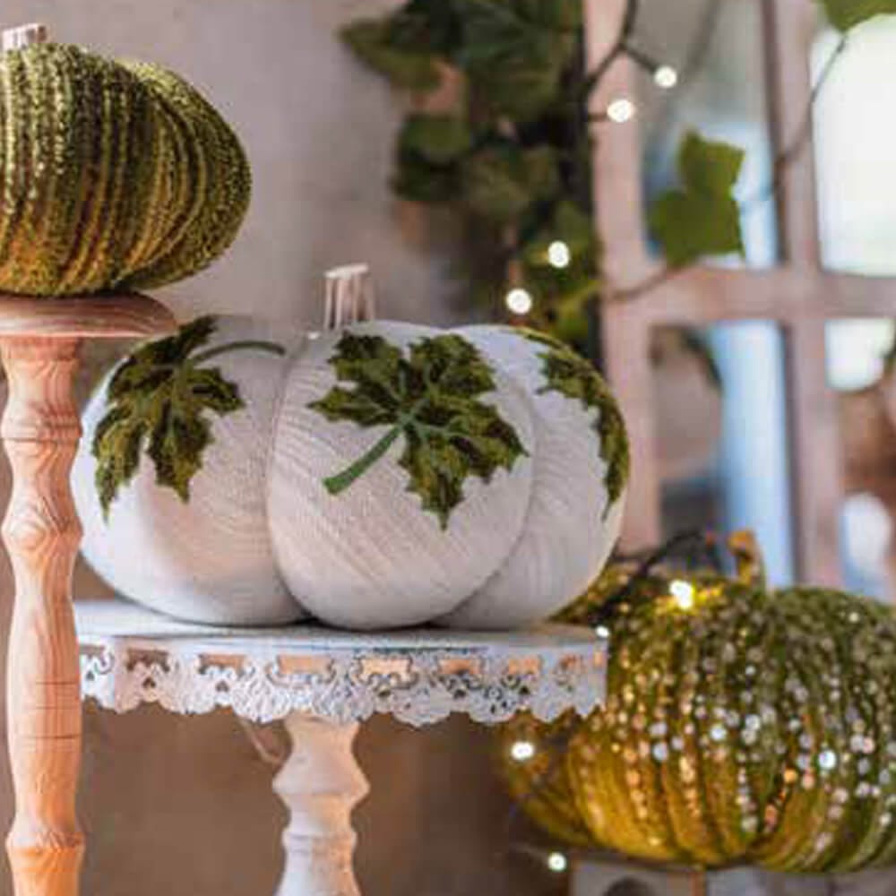 Bellissima zucca realizzata in tessuto Panna con foglie ricamate in rilievo verde scuro, che donano un aspetto realistico e sofisticato. Il gambo marrone in effetto legno completa la composizione autunnale.