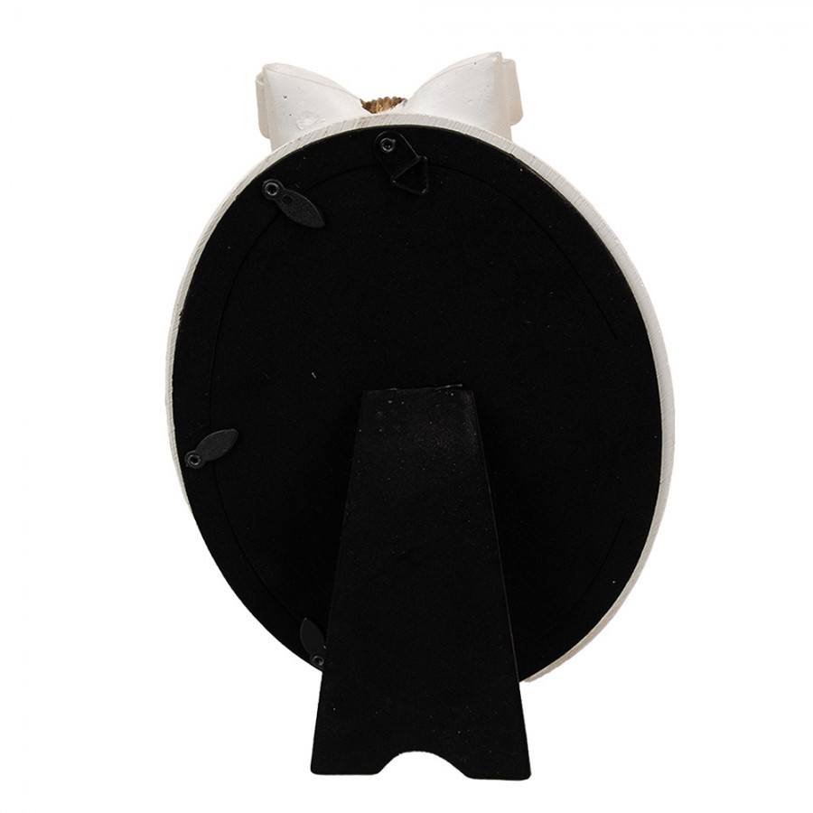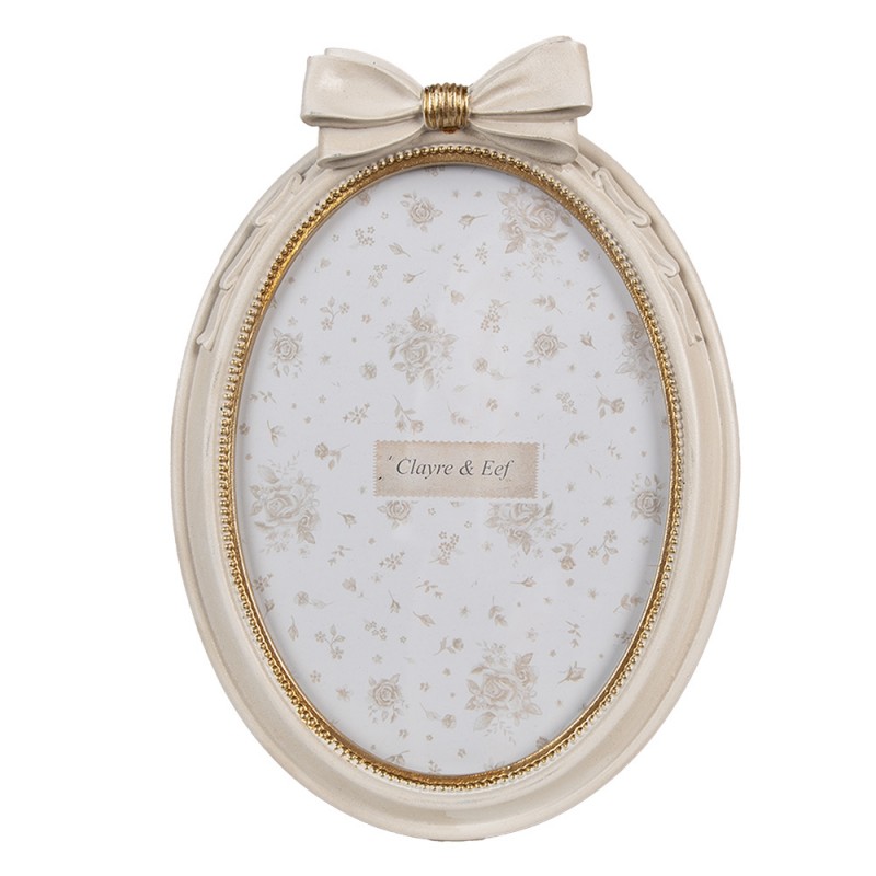 Bellissima cornice ovale realizzata in resina color Avorio antichizzato con bordino interno dorato. E’ impreziosita da un grande fiocco in rilievo sulla parte alta con particolare dorato.