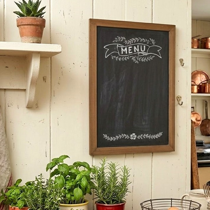 Bellissima lavagna Menù con cornice in legno. La scritta MENU e le decorazioni sono già presenti e indelebili