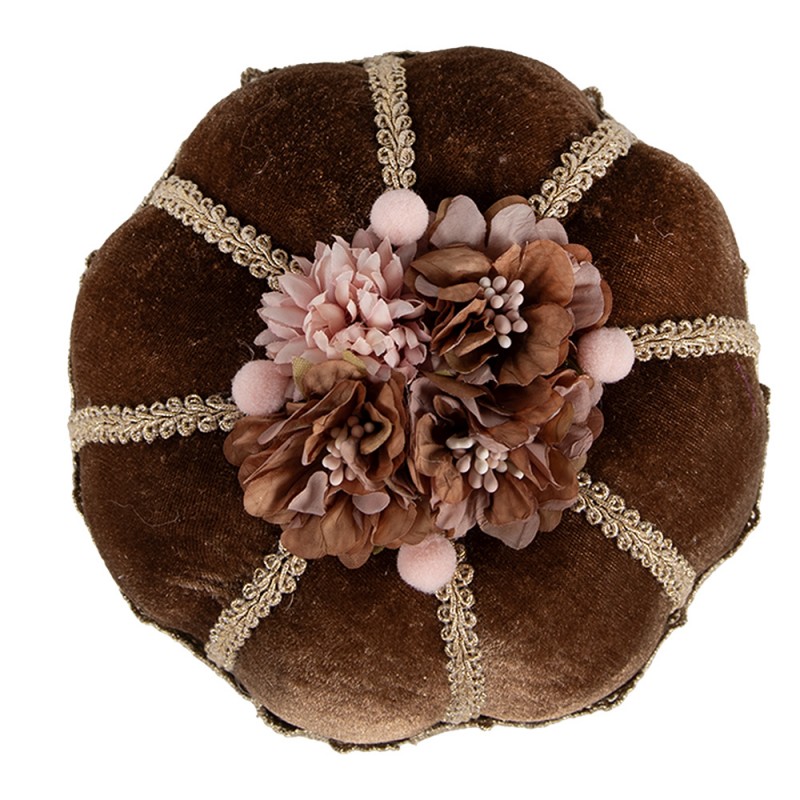 Deliziosa torta decorativa, realizzata in tessuto con interno rigido. La torta è ricoperta di tessuto marrone con leggere sfumature cangianti e impreziosita da passamaneria dorata e decoro floreale sul top, sui toni del Rosa.