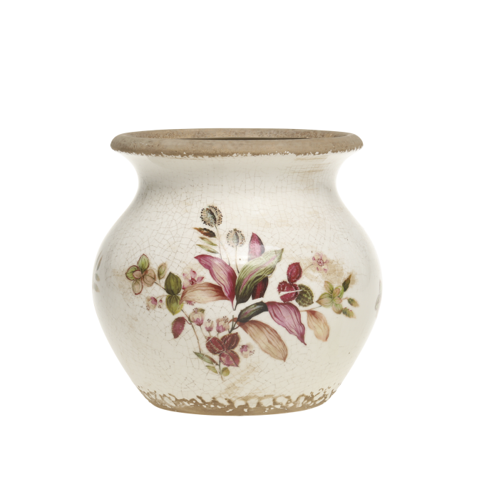 Bellissimo vaso in ceramica, decorato con un delicato disegno di rami e foglie Il vaso misura cm 17,5×16,5h ed è antichizzato artigianalmente.