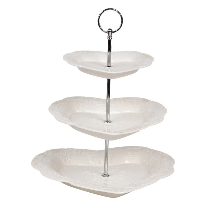 Bellissima alzata 3 piani realizzata in ceramica. Ogni piatto è a forma di cuore ed è decorato con motivi a rilievo. Colore Bianco.
