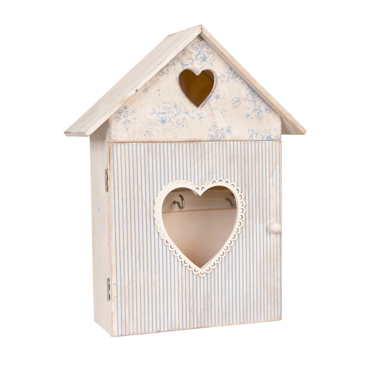 Bellissima casetta porta chiavi realizzata interamente in legno con antina e 6 ganci porta chiavi. L’antina è decorata con sottili righine Azzurre e con un grande cuore traforato e rifinito con un bordino in rilievo. La parte alta è decorata con motivo floreale anch’esso nei toni dell’Azzurro.