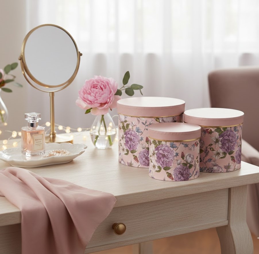 Delizioso set 3 cappelliere realizzate in robusto cartone, con coperchio.