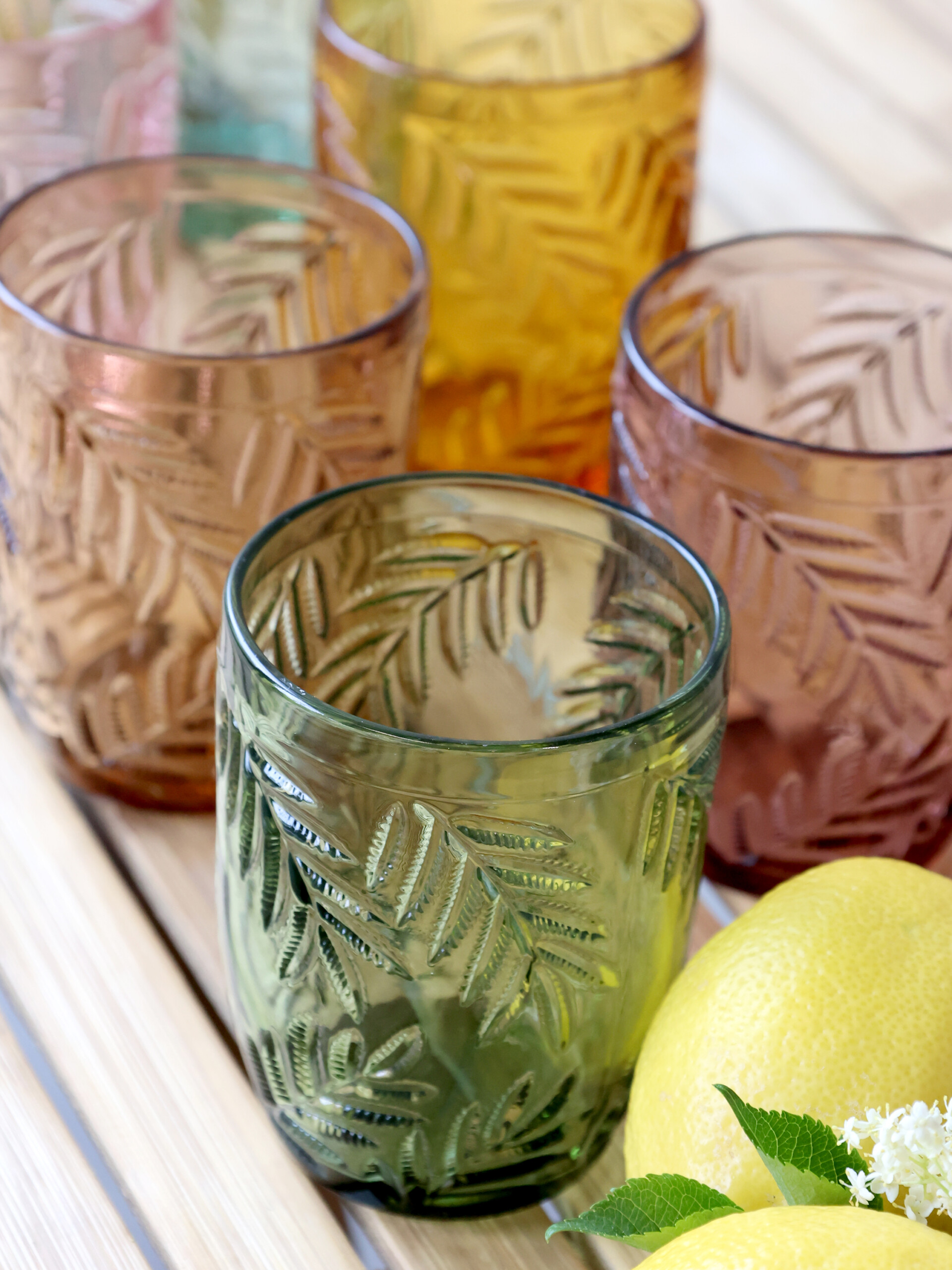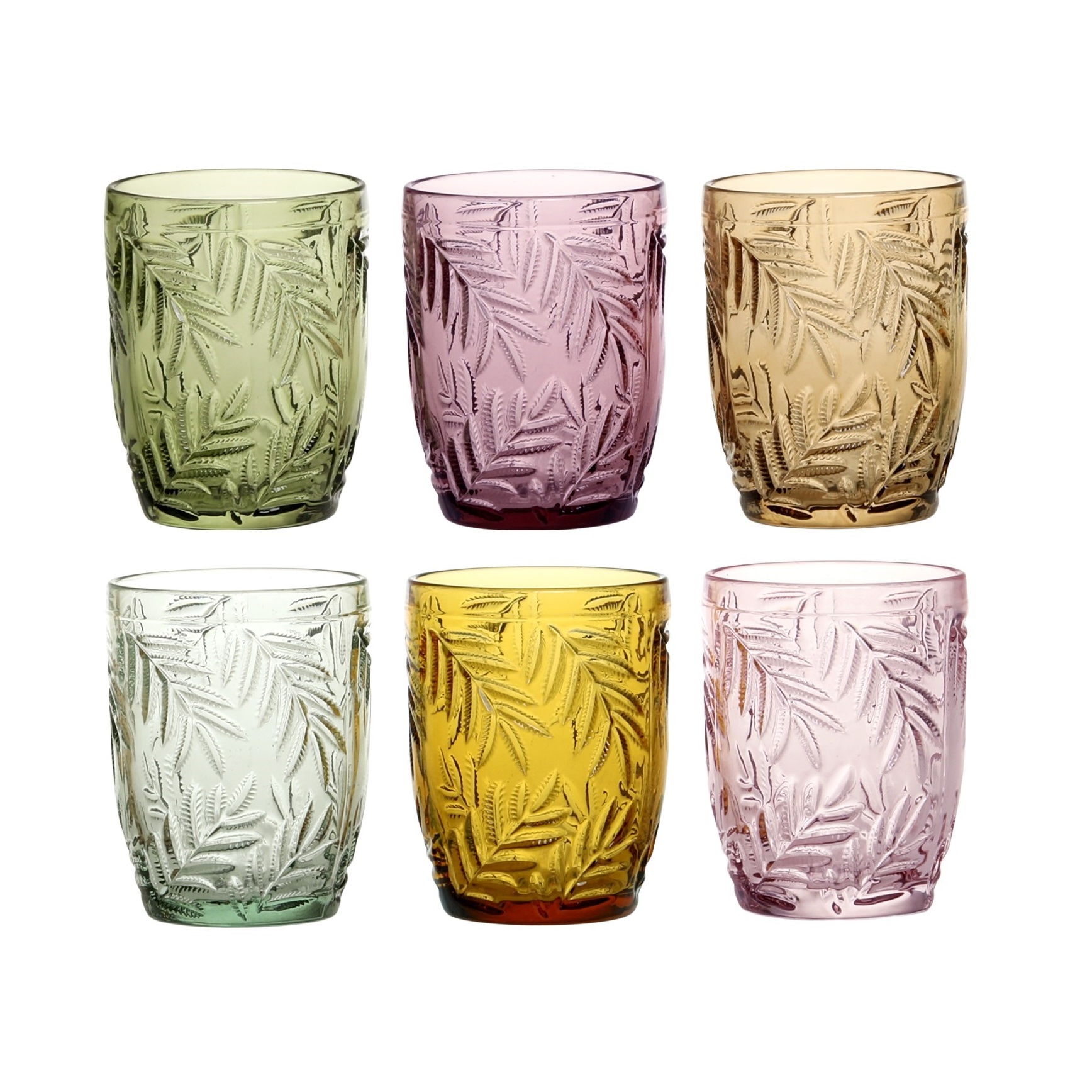 Bellissimo Set di 6 bicchieri in vetro con decoro in rilievo foglie. Il set è composto da bicchieri in sei diversi colori.