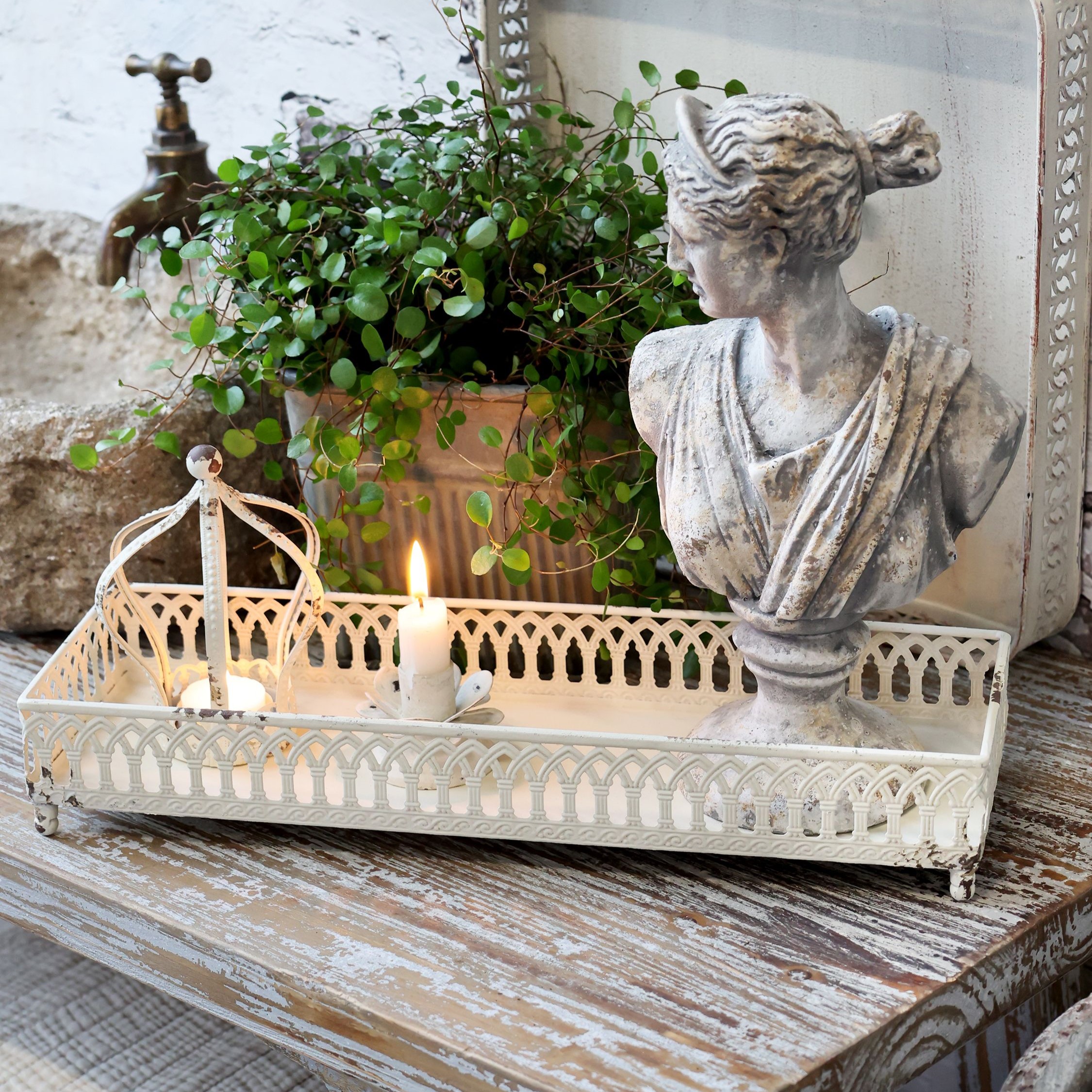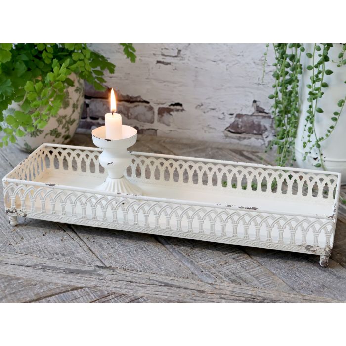 Bellissimo vassoietto realizzato in ferro con bordi alti interamente decorati. Resta leggermente sollevato poiché poggia su 4 piedini.