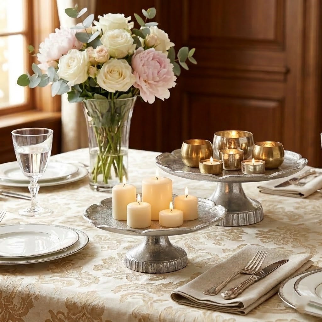 Bellissima alzata realizzata in metallo con finitura argentata a effetto leggermente martellato che gli conferisce un aspetto artigianale.