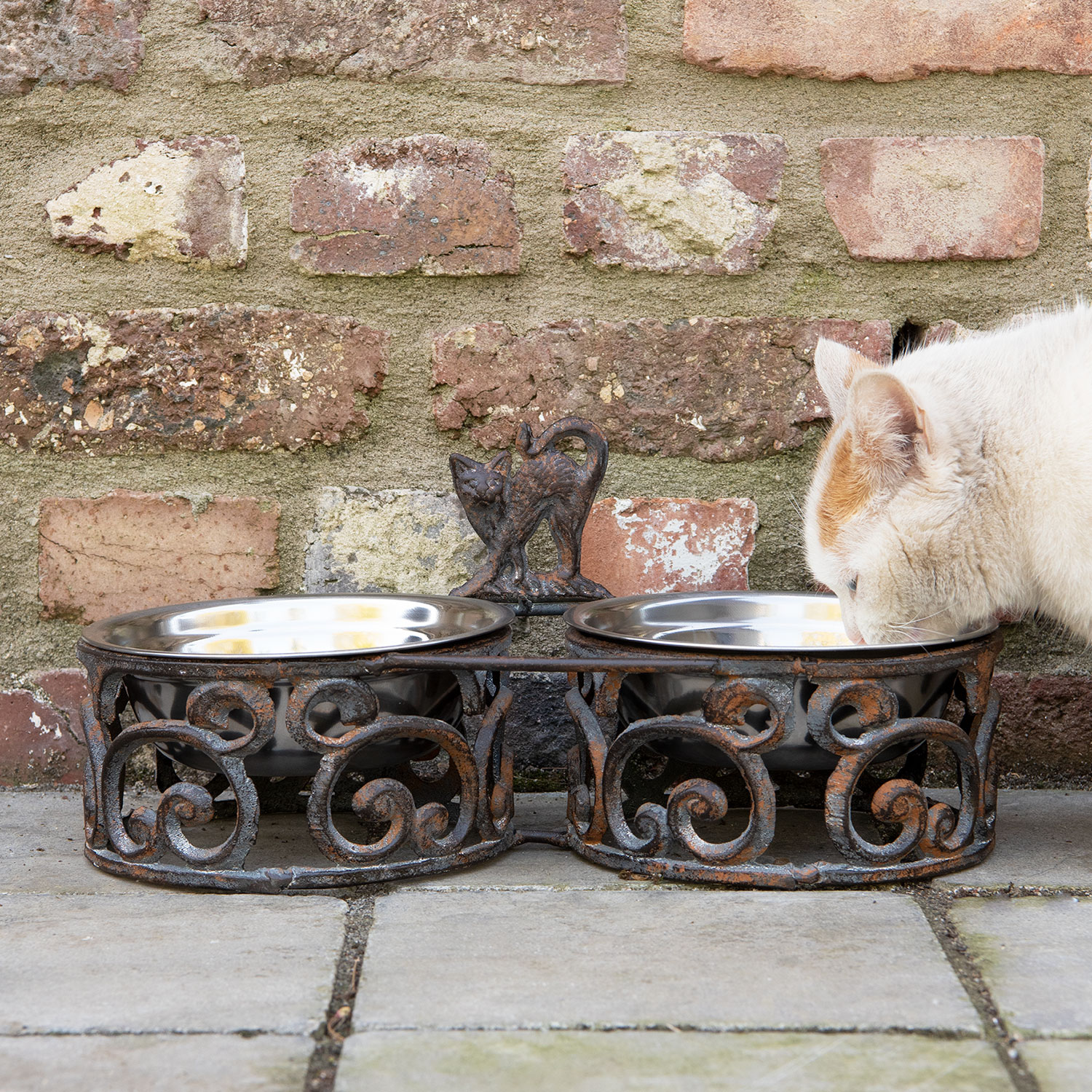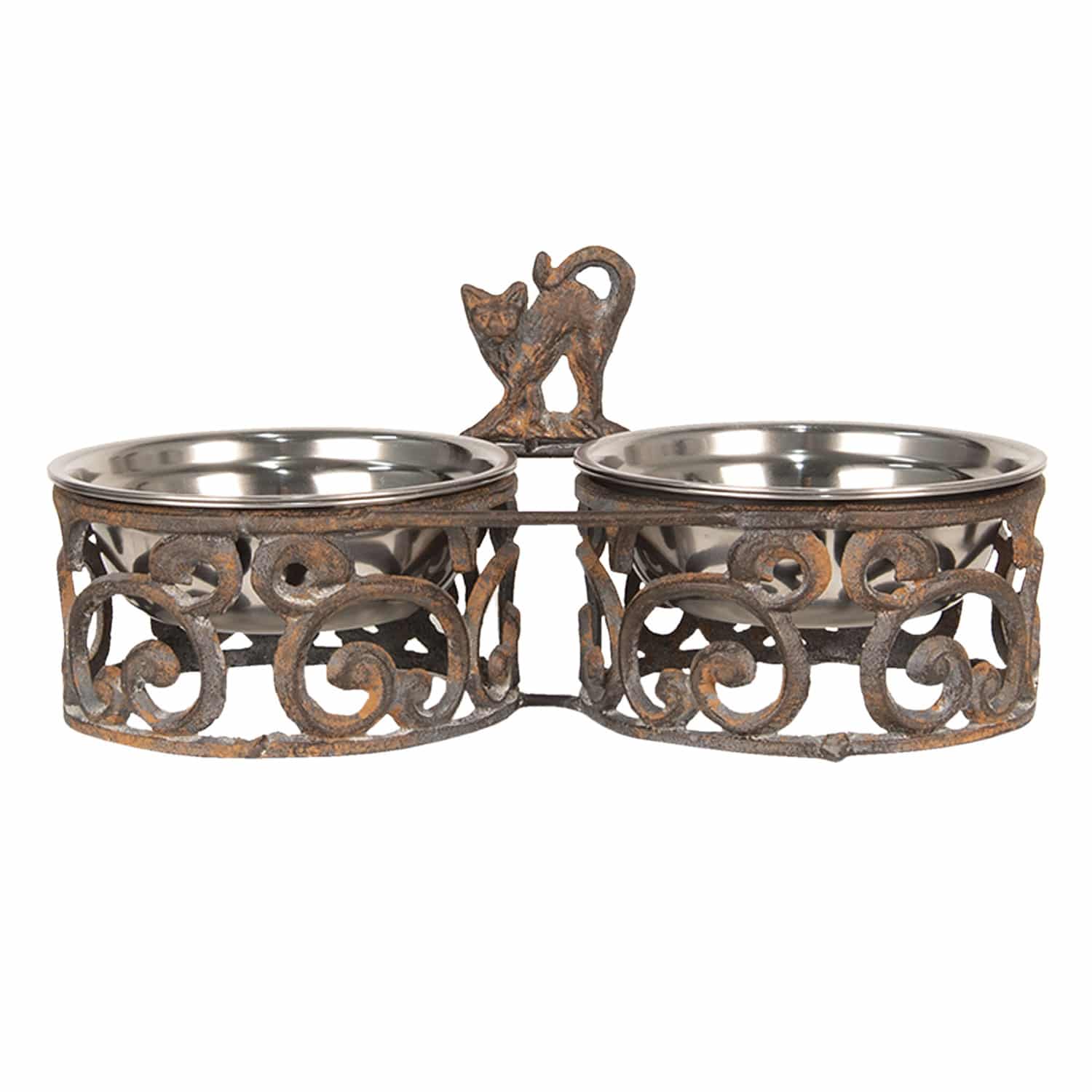 Carinissima doppia ciotola con gatto, realizzata in ferro battuto marron scuro e base decorata.