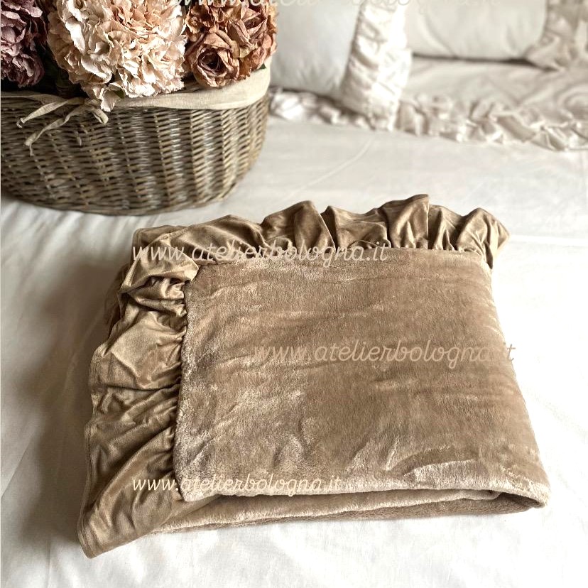Bellissimo plaid realizzato in morbido pile, con elegante rouche sui 4 lati. Colore Marrone