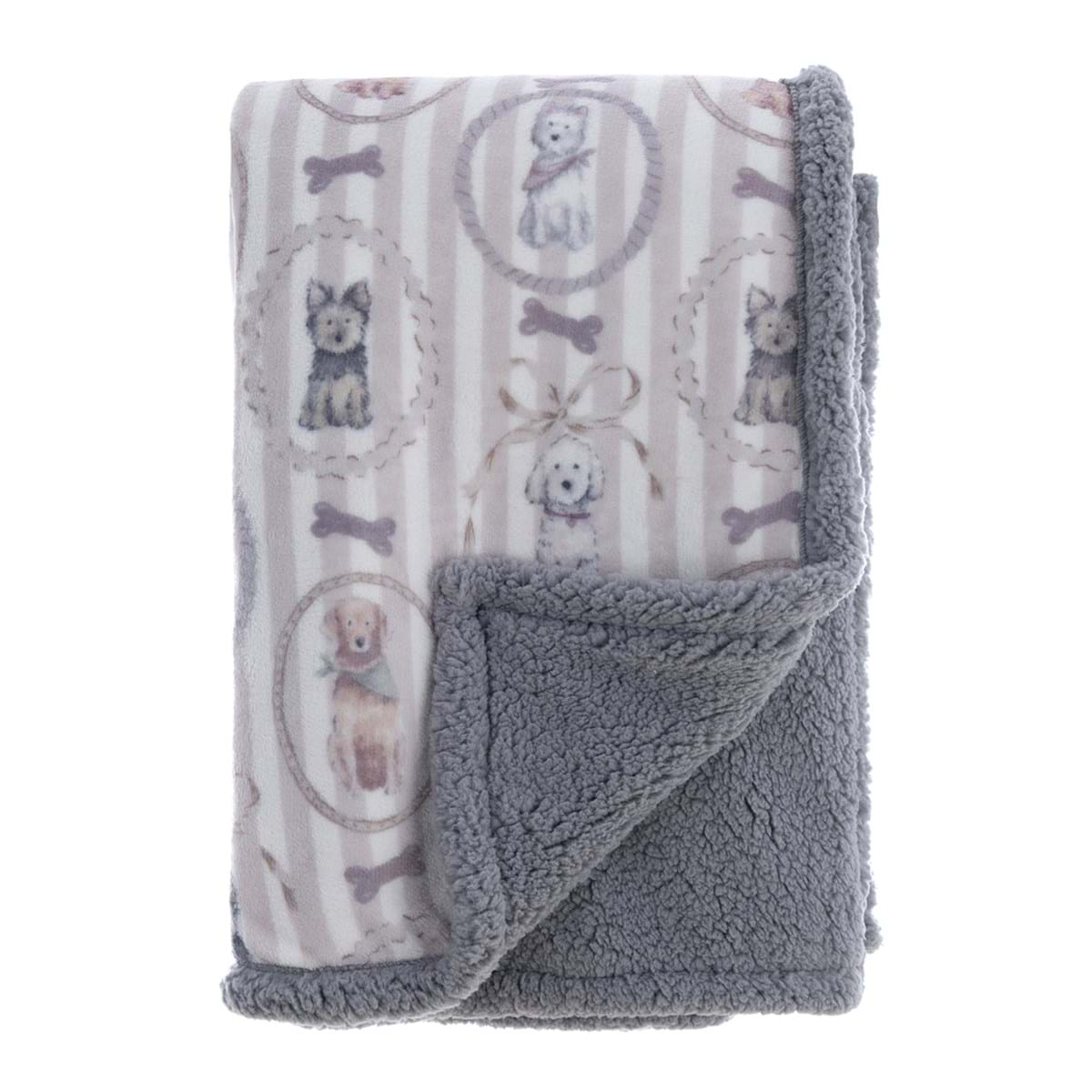 Morbidissimo plaid realizzato in soffice pile con delicata stampa Cagnolini nei toni del grigio e rosa tenue