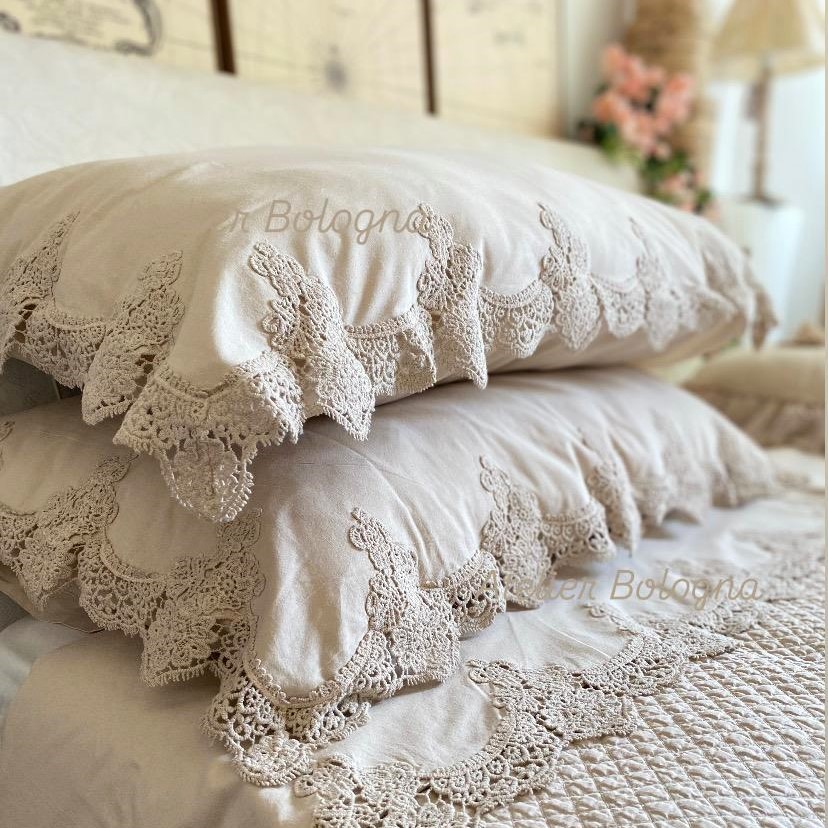Meraviglioso completo letto matrimoniale realizzato in puro cotone. Renderà subito romantica la vostra camera da letto.