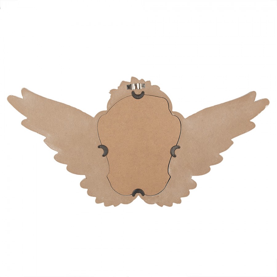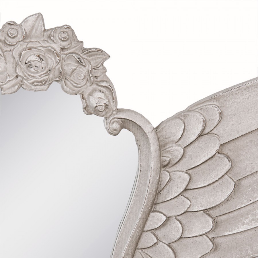 Bellissimo specchio sagomato realizzato in legno e mdf. Lo specchio è reso particolare da 2 grandi ali e decorato con rose in rilievo nella parte alta. Il colore è Grigio chiaro antichizzato con finitura artigianale vintage per un effetto leggermente vissuto.