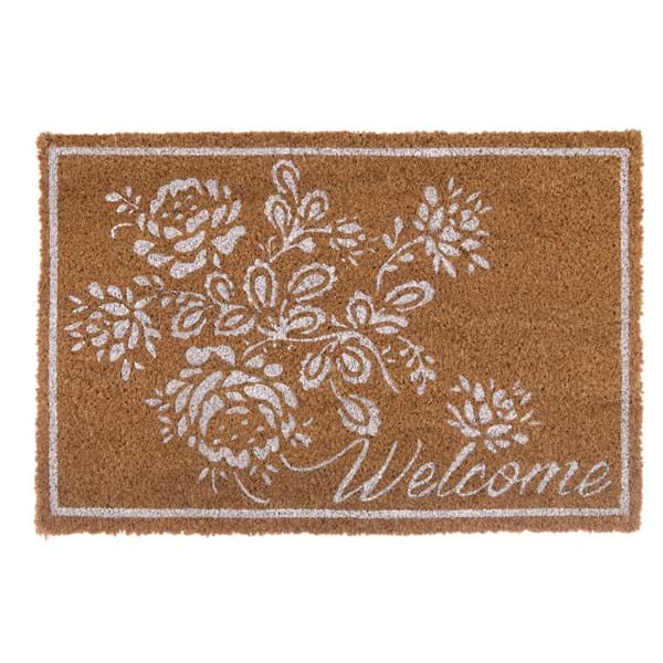 Delizioso zerbino con scritta Welcome e decoro floreale colore bianco