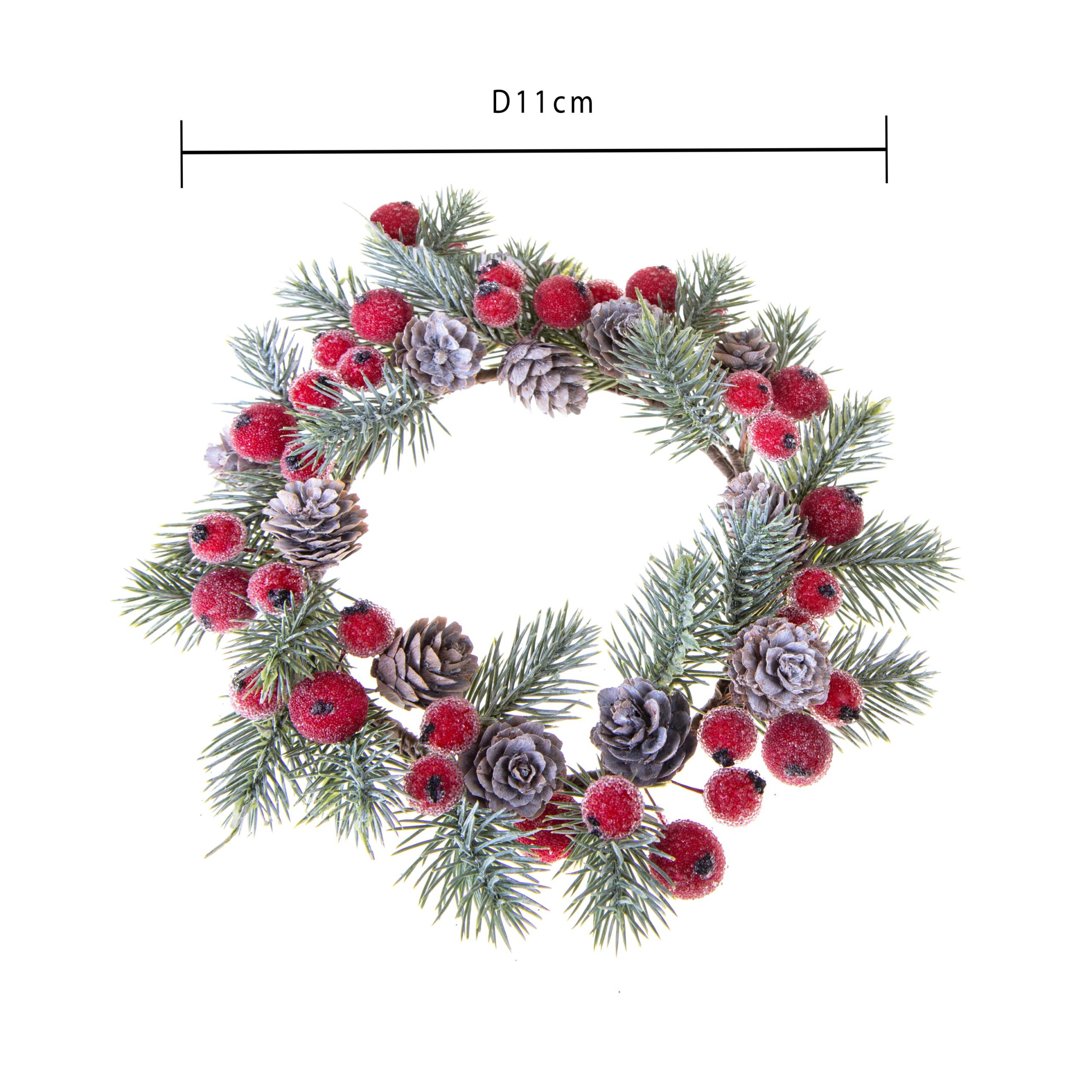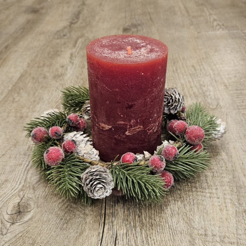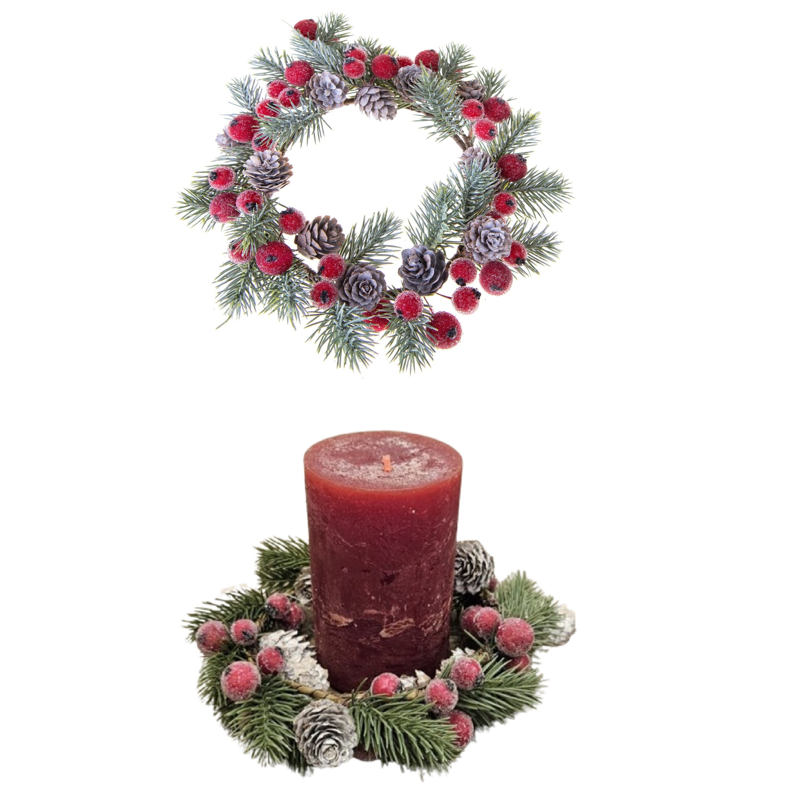 Ghirlanda centrotavola artificiale con pigne rametti di pino e bacche con effetto brinato. Realizzata in diametro di cm 20 , da utilizzare come girocandela centrotavola, può contenere candele di diametro massimo di cm 7 come le nostre candele rustiche da acquistare separatamente.