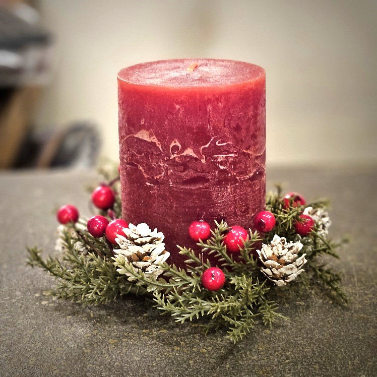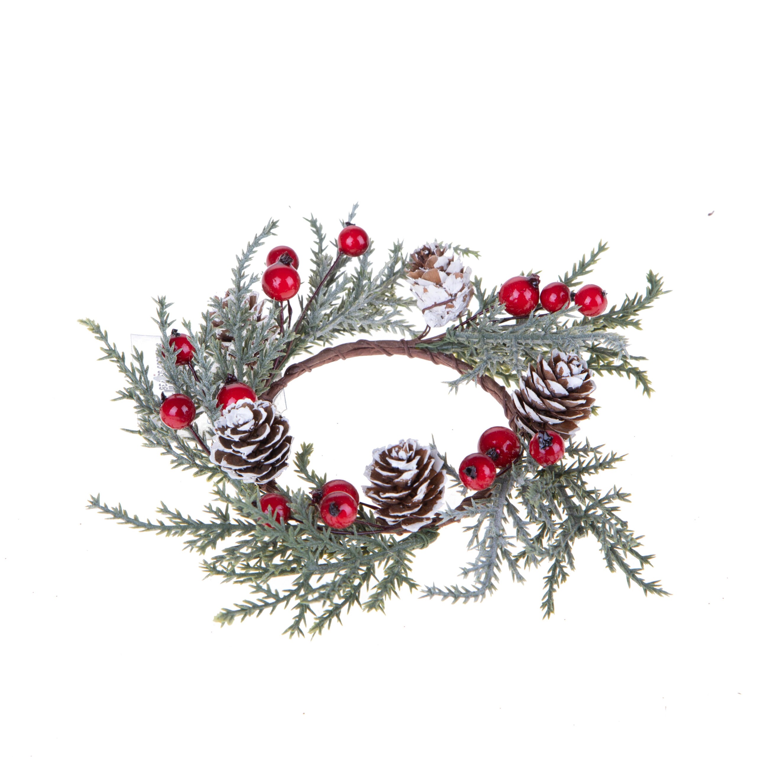 Ghirlanda centrotavola artificiale con bacche e pigne. Realizzata in diametro di cm 14 , da utilizzare come girocandela centrotavola, può contenere candele di diametro massimo di cm 7 come le nostre candele rustiche da acquistare separatamente.