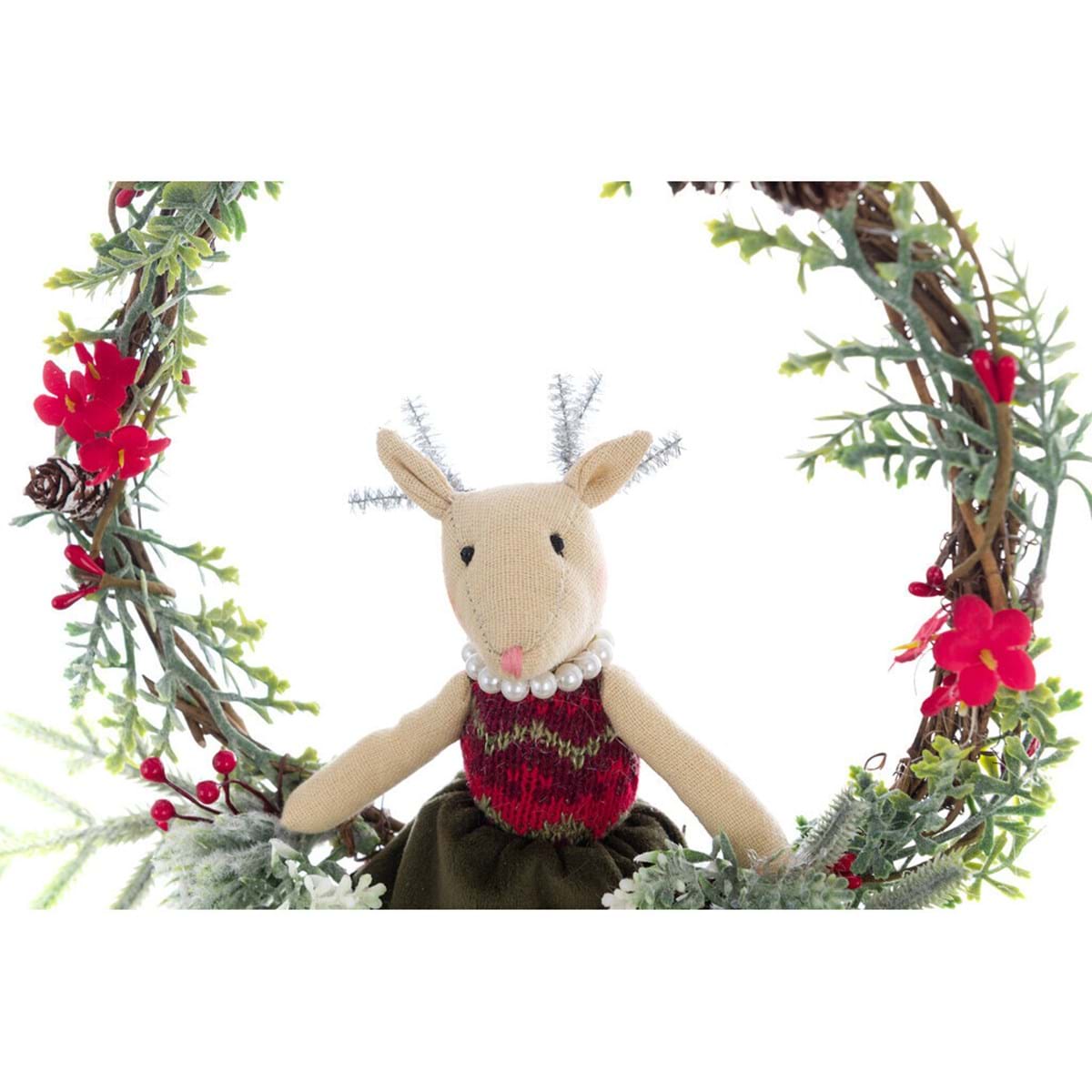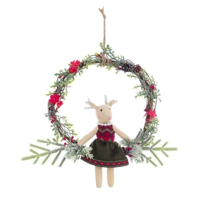 Bellissima ghirlanda natalizia, realizzata con rametti artificiali su una corona di legno intrecciato. La ghirlanda è impreziosita da una simpatica cervetta in abito natalizio.