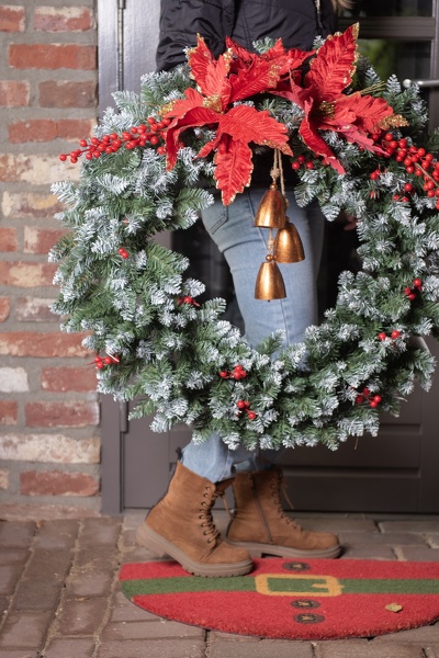 Bellissima ghirlanda artificiale natalizia con rametti di pino leggermente innevati e bacche rosse.