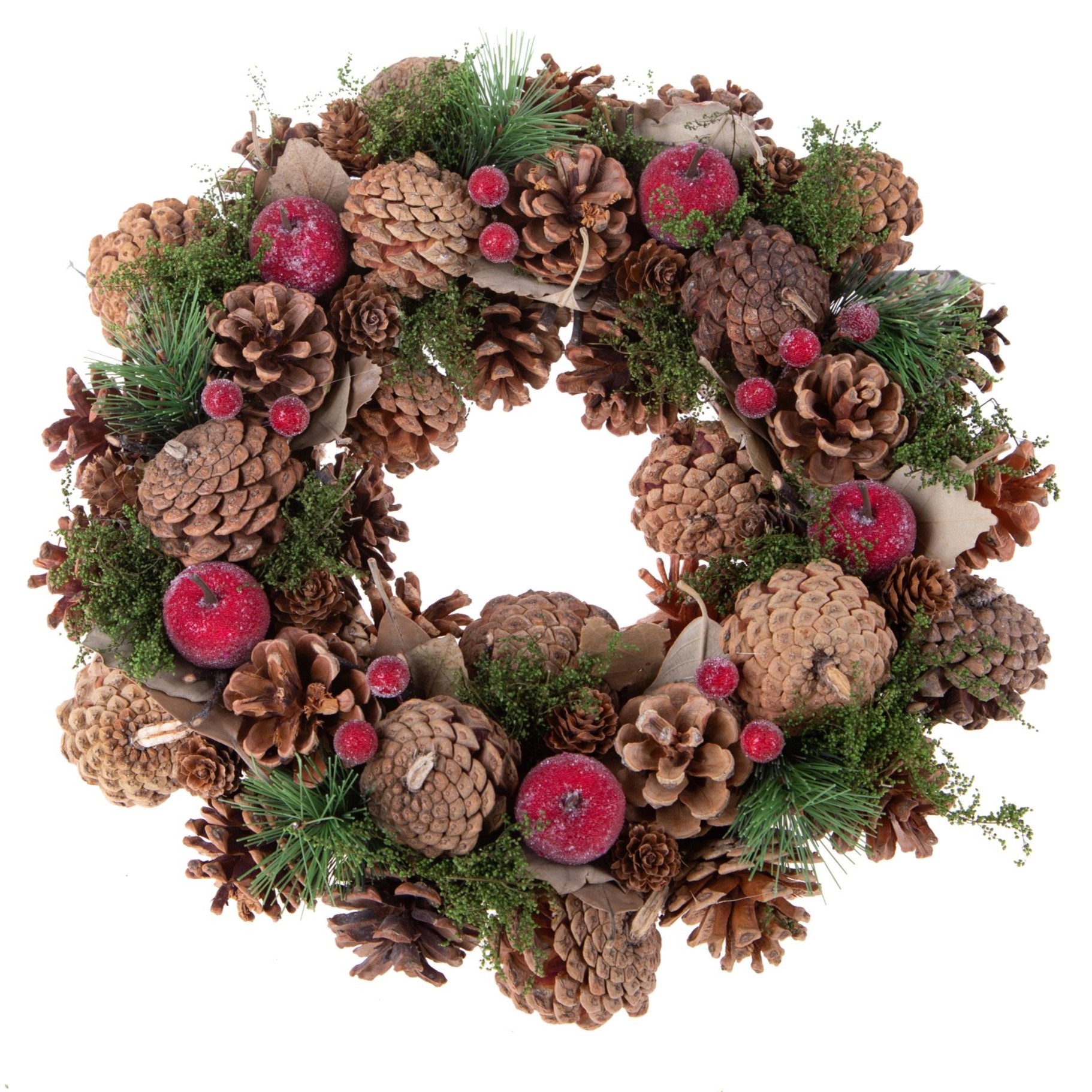 Bellissima ghirlanda natalizia, realizzata con pigne, bacche, rametti di pino e mele con effetto brinato . Grazie alla sua media grandezza, può essere appesa oppure utilizzata come centrotavola aggiungendo eventualmente al centro una bella candela.