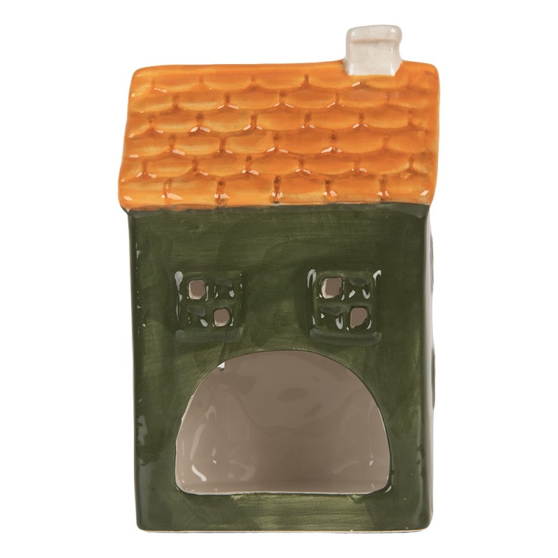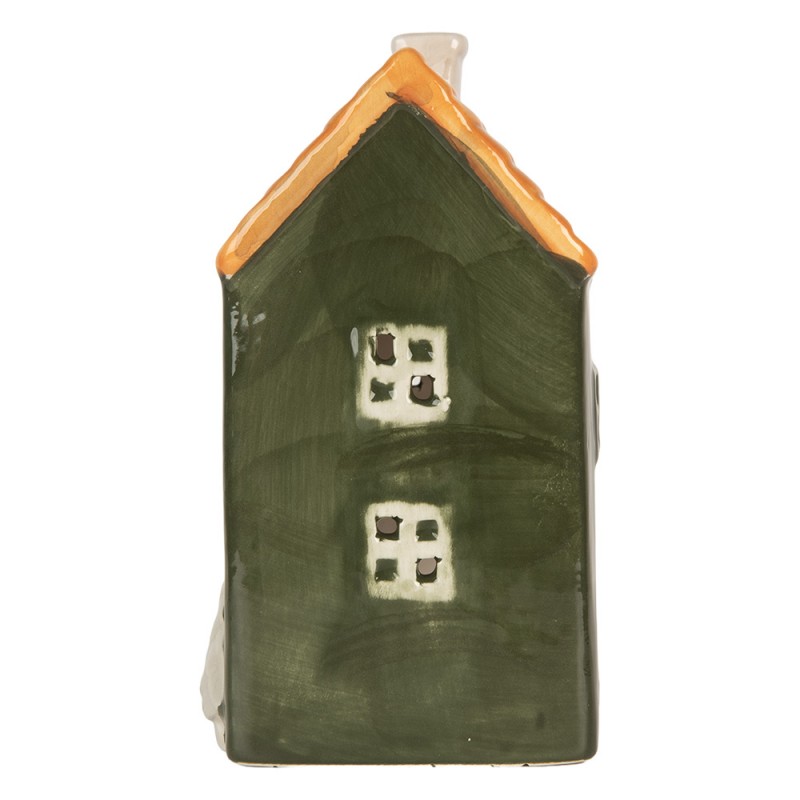 Bellissima casetta porta tealight realizzata in ceramica smaltata colore Verde con tetto Arancione. Decorata con alberelli e finestrelle intagliate che lasciano filtrare la luce della candela tealight, creando un delicato effetto luminoso.